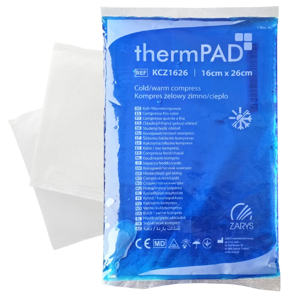 Kompres żelowy zimno/ciepło ThermPAD to wyrób medyczny. Przeznaczony do stosowania w terapii bólu oraz w stanach zapalnych. Może być używany na ciepło lub zimno, w zależności od potrzeb. Kompres jest zapakowany w materiał, który umożliwia łatwe zastosowanie. Należy przestrzegać instrukcji dotyczących przygotowania i używania, aby zapewnić skuteczność oraz bezpieczeństwo stosowania. Produkt jest przeznaczony do wielokrotnego użytku.Przeznaczenie produktu