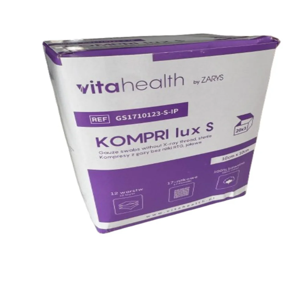 Kompresy jałowe (IP) KOMPRI LUX S z gazy 17N to wyrób medyczny przeznaczony do opatrywania ran. Produkt wykonany jest z miękkiej, chłonnej gazy, zapewniającej odpowiednią wentylację. Kompresy są sterylne, co minimalizuje ryzyko zakażeń. Służą do zastosowań w medycynie, kosmetologii oraz w domowej pierwszej pomocy. Dostępne w pakowaniu po 20 sztuk.Przeznaczenie produktu