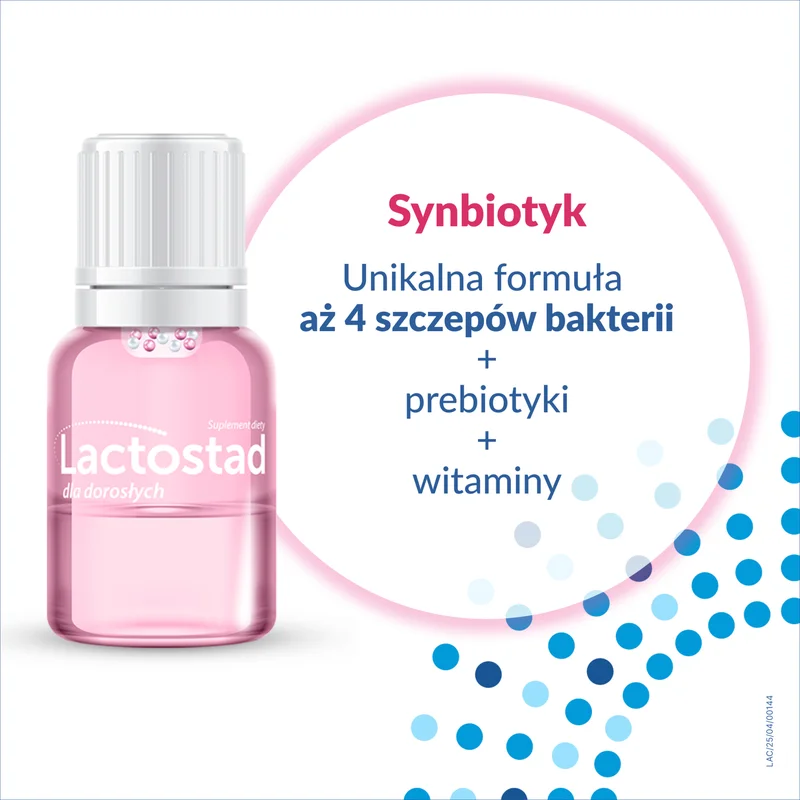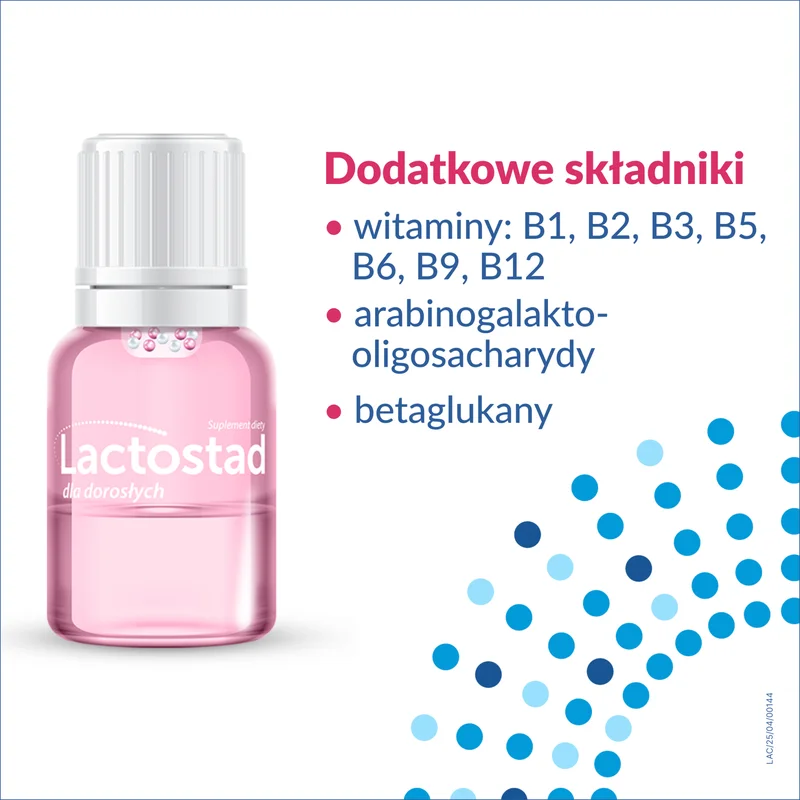 Supelement diety zawierający dawkę żywych kultur bakterii, co najmniej 50 miliardów wyjściowo w każdej fiolce. Lactostad zawiera 4 różne szczepy bakterii fermentacji mlekowej, prebiotyki, witaminy i Aloes zwyczajny, które pomagają w prawidłowym funkcjonowaniu układu odpornościowego (witamina B6,B12, kwas foliowy), w utrzymaniu prawidłowego stanu błon śluzowych (niacyna) oraz przyczyniają się do utrzymania prawidłowego metabolizmu energetycznego (niacyna, kwas pantotenowy, witamina B1,B6,B12).