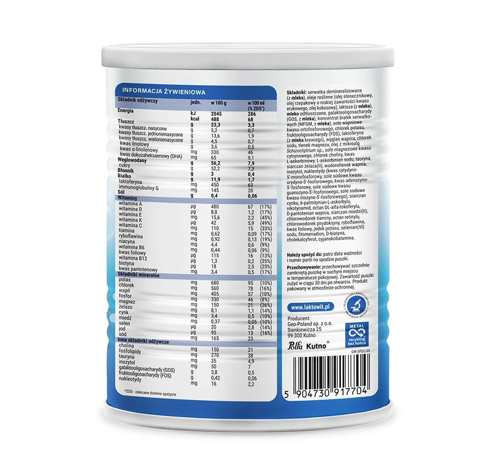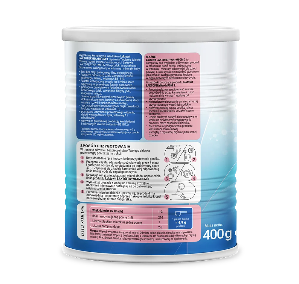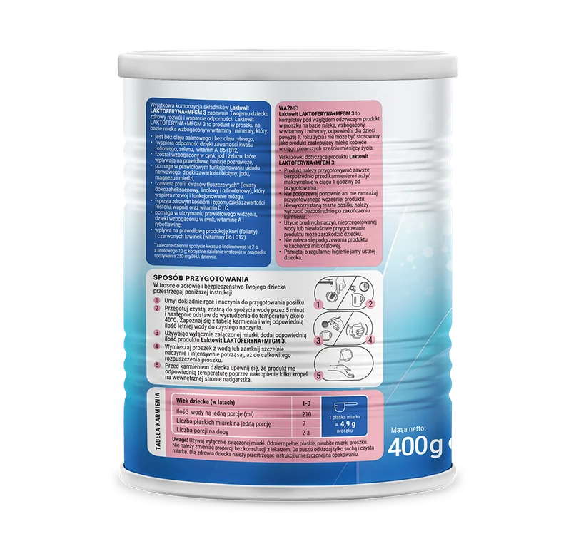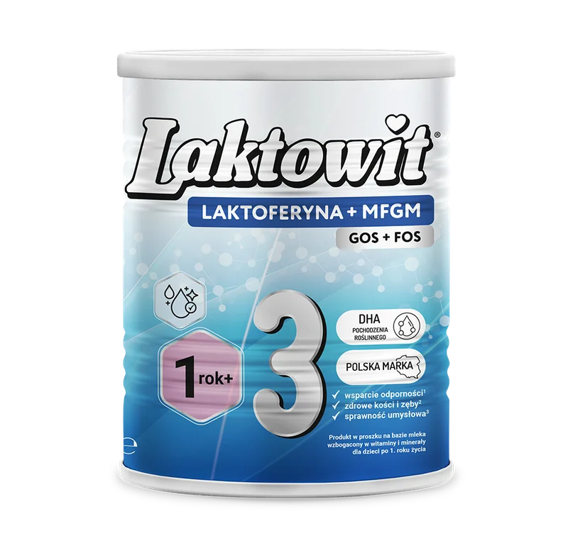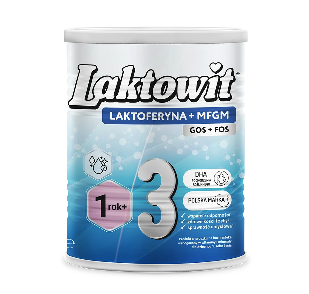 Laktowit 3 LAKTOFERYNA+MFGM to produkt na bazie mleka w postaci proszku przeznaczony dla dzieci powyżej 1. roku życia. Jego skład został opracowany tak, aby wspierać prawidłowy rozwój dziecka. Formuła zawiera laktoferynę oraz tłuszcz mleczny MFGM – składniki występujące naturalnie w mleku matki, a rzadziej dodawane do standardowych mlek modyfikowanych.