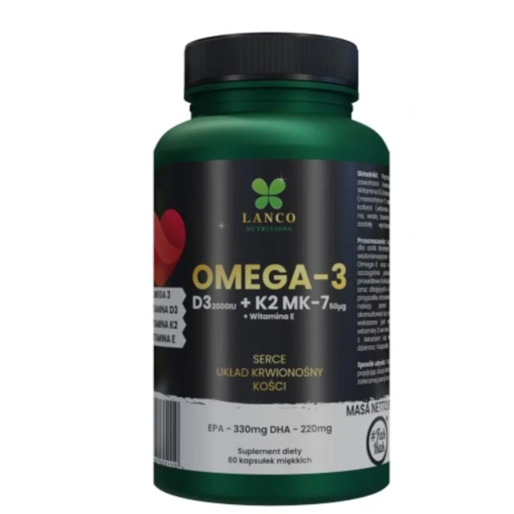 Lanco Omega-3 + D3 + K2 to suplement diety w kapsułkach, którego składniki wspierają prawidłowe funkcjonowanie układu sercowo-naczyniowego, odpornościowego oraz utrzymanie zdrowych kości i zębów. Produkt dla osób dorosłych.