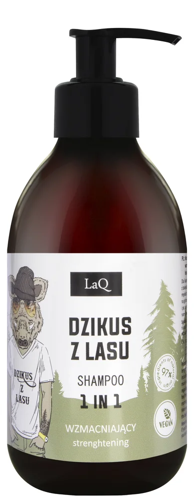 LaQ Dzikus z lasu, Naturalny szampon do włosów dla facetów z kompleksem wzmacniającym z żeń-szenia, łopianu, skrzypu i przytulii - delikatny kosmetyk do oczyszczania i pielęgnacji męskich włosów. Wskazany szczególnie do włosów nadmiernie wypadających.Stosowanie produktu