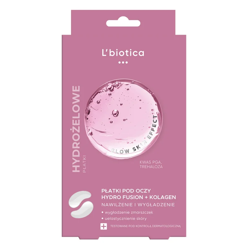 L'biotica Hydrożelowe Płatki pod oczy z kolagenem z aktywną hydroformułą zawierającą kwas poliglutaminowy SynerPGAHydroPower+®, kolagen, kompleks cukrowy oraz Microbiom Dermoprotect cplx natychmiastowo wygładzają skórę i redukują widoczność zmarszczek. Formuła Hydro Fusion:SynerPGAHydroPower+® – kwas poliglutaminowy, będący unikalnym polipeptydem o cenionych przez dermatologów właściwościach pielęgnacyjnych. Nawilża i wygładza - zatrzymuje w skórze do 5000 razy więcej wody niż sam waży, dając natychmiastowy, widoczny efekt hydrowypełnienia: długotrwałe nawilżenie, ujędrnienie i wygładzenie. Zwiększa ilość NMF (naturalnego czynnika nawilżającego) w skórze, odpowiedzialnego, za utrzymanie optymalnego wewnętrznego nawilżenia oraz ochronę przed transepidermalną utratą wody.Hamuje produkcję melaniny, zapewniając rozjaśnienie i wyrównanie kolorytu. Utrzymuje prawidłowe pH skóry.Właściwości produktu