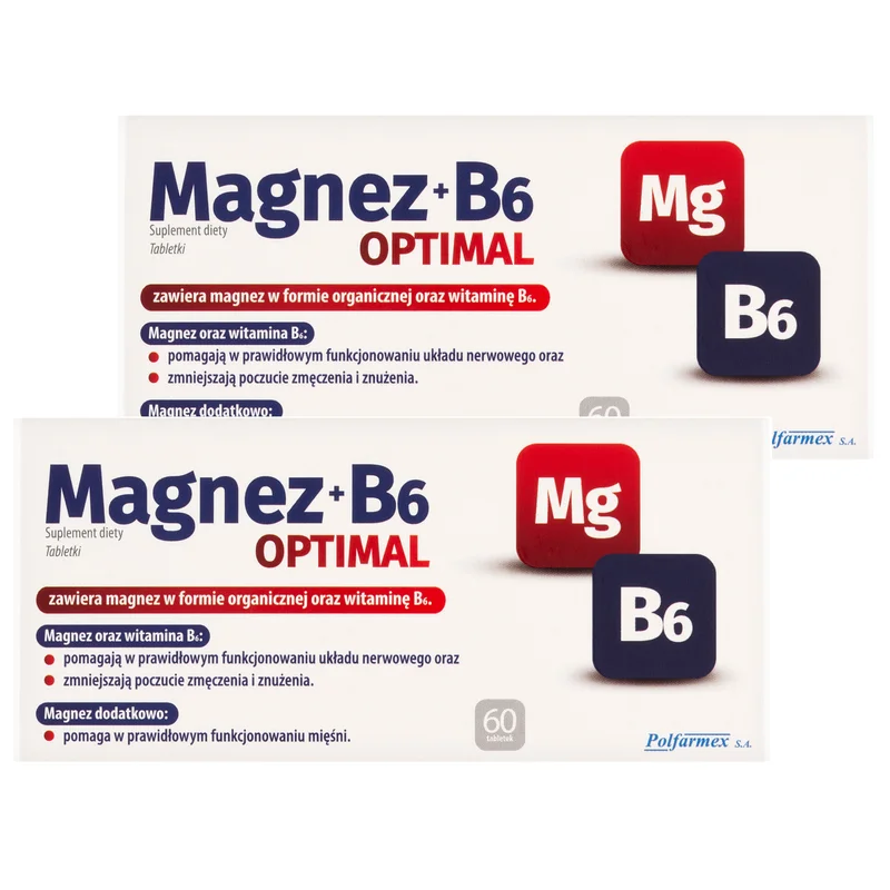 Magnez+B6 Optimal - suplement diety posiadający w składzie magnez i witaminę B6. Produkt przeznaczony dla dorosłych i młodzieży powyżej 12 roku życia.