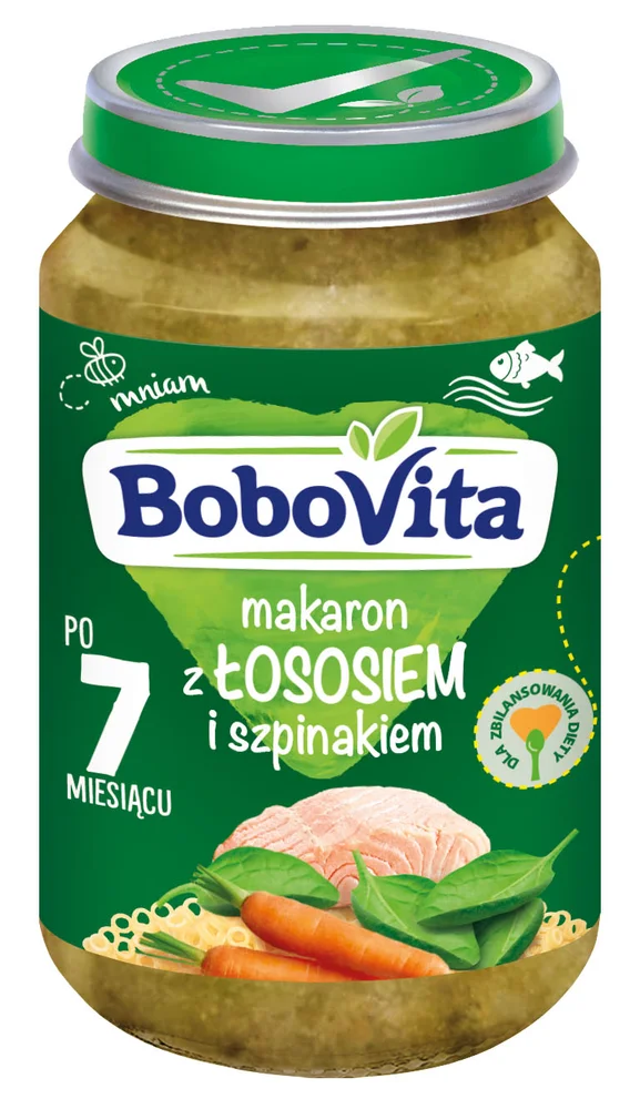 Makaron z łososiem i szpinakiem dla dzieci po 7. miesiącu życia to środek spożywczy specjalnego przeznaczenia żywieniowego opracowany z myślą o potrzebach niemowląt rozpoczynających rozszerzanie diety. Połączenie ryby, warzyw i makaronu daje delikatny smak oraz konsystencję dostosowaną do umiejętności jedzenia malucha.