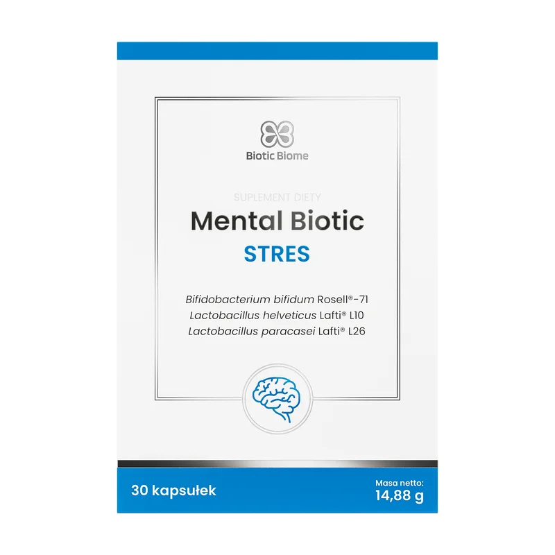 Biotic Biome Mental Biotic Stres to suplement diety, którego składniki wspierają prawidłowe funkcjonowanie układu nerwowego oraz ułatwiają zasypianie. Zawiera 3 szczepy bakterii probiotycznych, inulinę, melatoninę, cynk oraz witaminy z grupy B. Produkt dla osób dorosłych.