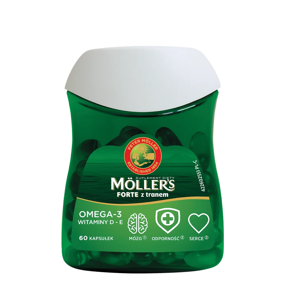 Möller’s Forte z tranem to najważniejsze składniki tranu skoncentrowane w kapsułkach. Stanowi bogate źródło kwasów omega-3 i witaminy D3.