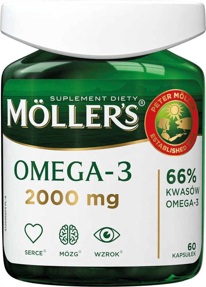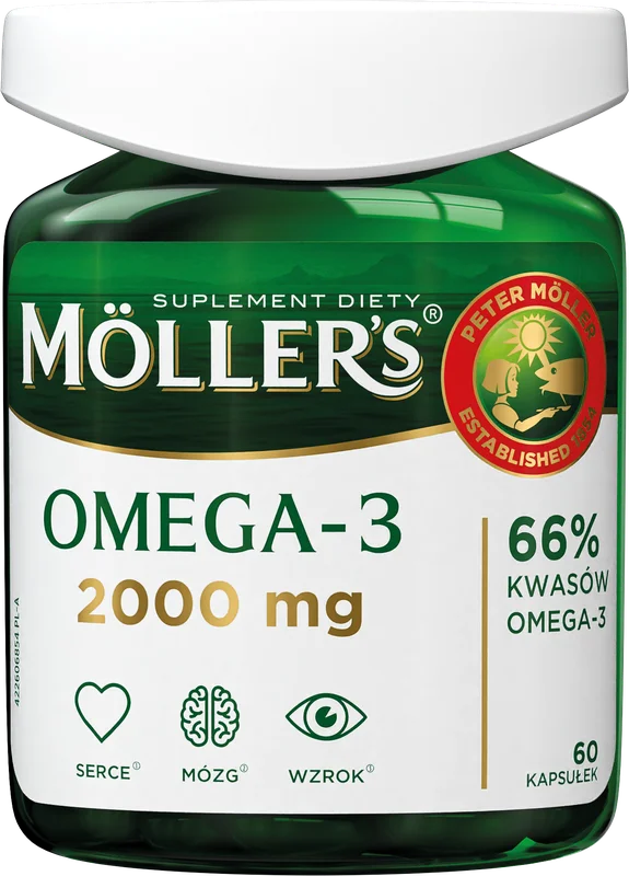 Moller's Omega-3 2000 mg to suplement diety, który zawiera kwasy tłuszczowe omega-3, wykazujące korzystny wpływ na funkcjonowanie serca oraz wspierające prawidłowe działanie mózgu. Składniki suplementu pomagają w utrzymaniu prawidłowych poziomów lipidów we krwi oraz wspomagają funkcje poznawcze. Produkt odpowiedni dla osób dorosłych oraz dzieci powyżej 11. roku życia.