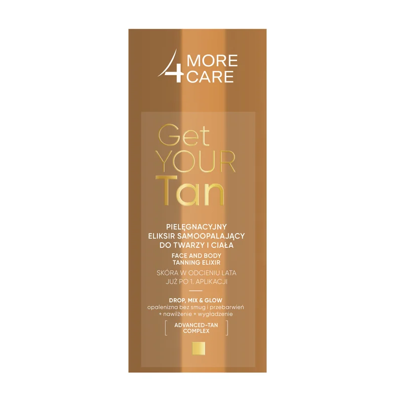 More4Care Get Your Tan eliksir samoopalający do twarzy i ciała to produkt kosmetyczny. Produkt przeznaczony do samoopalania, pomagający uzyskać naturalny, brązowy odcień skóry. Umożliwia równomierną oraz łatwą aplikację, co przyczynia się do estetycznego wyglądu opalenizny. Zawiera składniki, które mogą wspierać nawilżenie skóry. Do stosowania na twarzy i ciele. Idealny dla osób pragnących uzyskać opaleniznę bez ekspozycji na słońce.