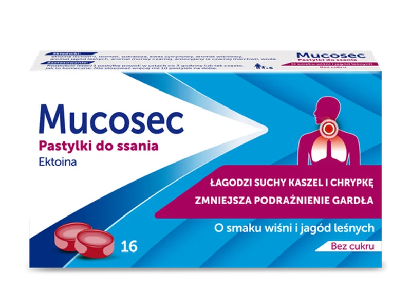 Pastylki do ssania Mucosec mają zastosowanie w leczeniu i zapobieganiu objawom przeziębienia, suchości jamy ustnej i gardła oraz chrypki. Produkt zawiera Ektoin®, który jest naturalną cząsteczką chroniącą komórki, łagodzącą stany zapalne i stabilizującą błony komórkowe.Ostrzeżenia i środki ostrożności