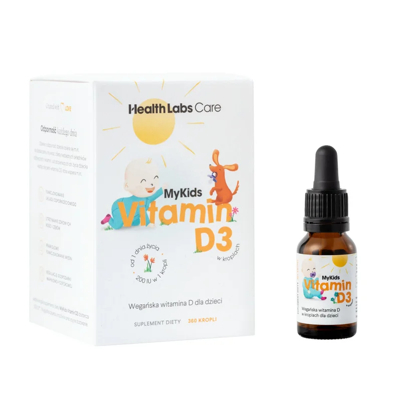 Health Labs Care, MyKids Vitamin D3 w kroplach to suplement diety, który zawiera witaminę D3 pozyskiwaną z lanoliny. Składniki suplementu wspierają prawidłowe funkcjonowanie układu odpornościowego oraz przyczyniają się do utrzymania zdrowych kości i zębów. Suplement może być stosowany jako uzupełnienie codziennej diety. Produkt przeznaczony jest dla dzieci już od 1. dnia życia, a jego formuła w kroplach zapewnia łatwość dawkowania.