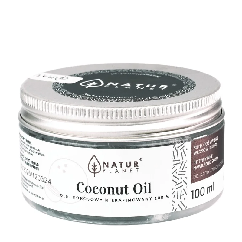 Natur Planet Coconut Oil 100% olej kokosowy nierafinowany jest produktem kosmetycznym o działaniu odżywczym i regeneracyjnym.