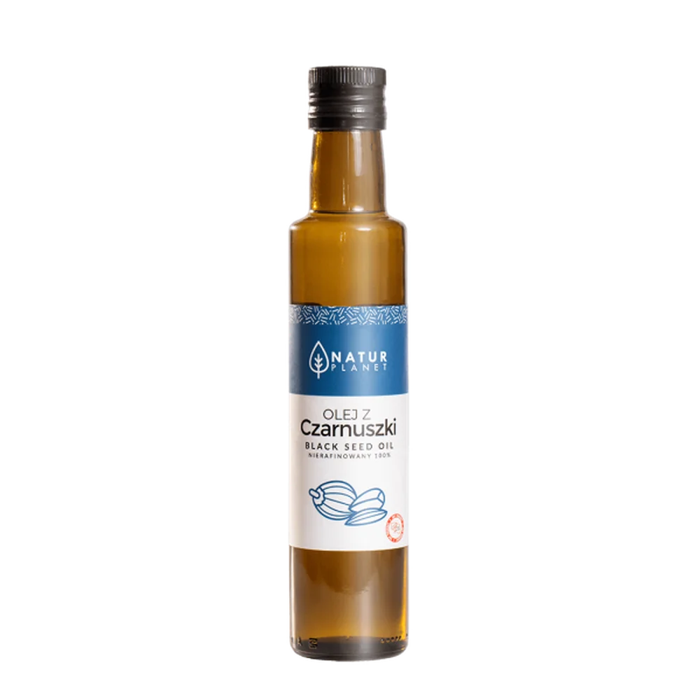 NATUR PLANET Olej z czarnuszki nierafinowany to suplement diety, którego składniki wspierają odporność, mogą wspomagać funkcje układu immunologicznego, a także przyczyniają się do wsparcia w przypadku alergii oraz problemów skórnych. Produkt może być stosowany na zimno w sałatkach lub jako dodatek do potraw, a także wykorzystywany w celach kosmetycznych.Składniki