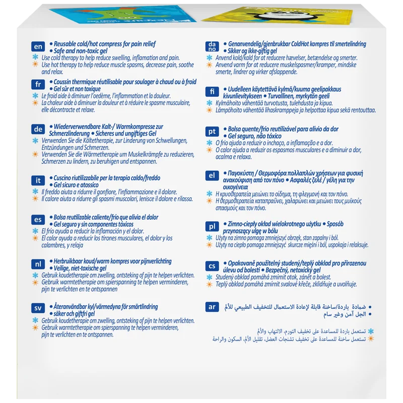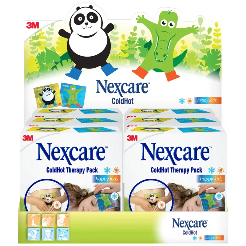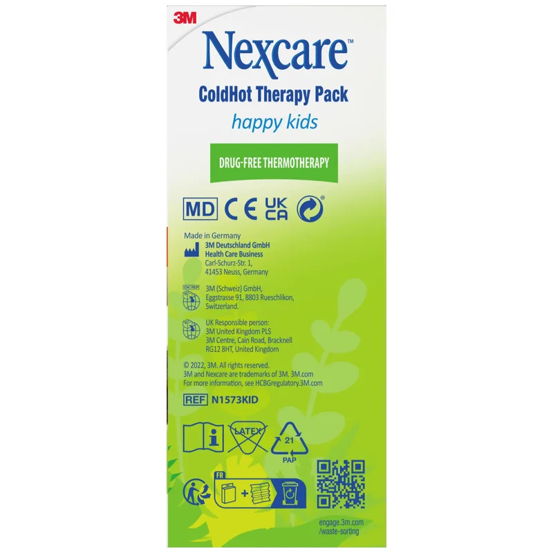 Sposób użycia Nexcare Cold Hot Happy Kids Okład zimno-ciepły 11 x 12 cm: użyty po schłodzeniu pomaga zmniejszyć obrzęk, stan zapalny i ból. Okład zastosowany na ciepło pomaga zmniejszyć skurcze mięśni i ból.Zawartość opakowania