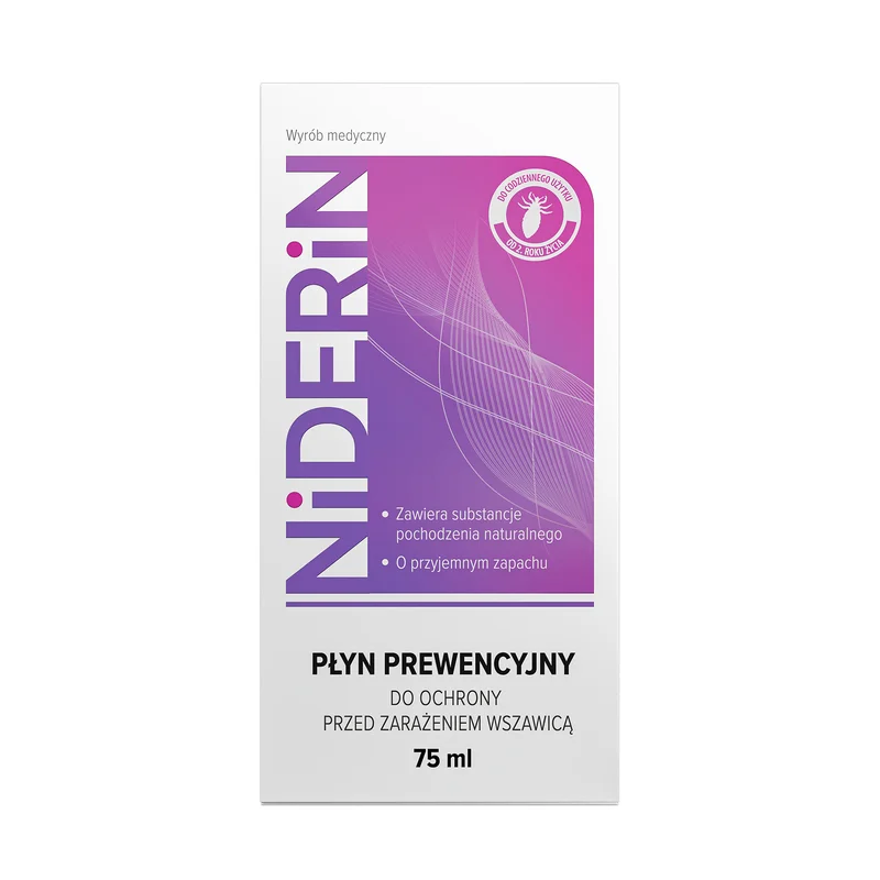 Niderin Płyn Prewencyjny jest przeznaczony do ochrony włosów i odzieży przed zarażeniem wszawicą.