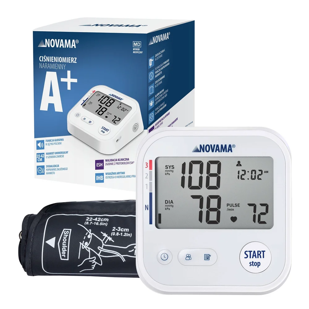 NOVAMA A+ to wyrób medyczny ciśnieniomierz naramienny automatyczny z ekranem panoramicznym. Urządzenie umożliwia pomiar ciśnienia krwi oraz tętna. Wyposażone jest w funkcję wykrywania arytmii i pamięci pomiarów. Prosty w obsłudze, zapewnia czytelny odczyt wyników na dużym ekranie. Przeznaczone do użytku domowego, stosowane w codziennej kontroli stanu zdrowia.Ostrzeżenia i środki ostrożności