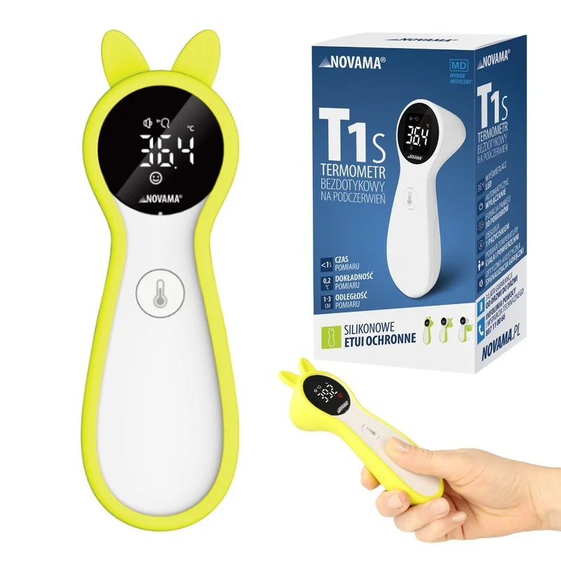NOVAMA T1S to wyrób medyczny. Jest to termometr bezdotykowy na podczerwień, który umożliwia szybki pomiar temperatury ciała. Urządzenie przeznaczone jest do zastosowania w warunkach domowych oraz w placówkach medycznych. Termometr wyróżnia się prostą obsługą oraz czytelnym wyświetlaczem. Nadaje się do pomiaru temperatury u dorosłych i dzieci. Oferuje funkcję pamięci, pozwalającą na zapisanie kilku ostatnich wyników pomiarów.Ostrzeżenia i środki ostrożności