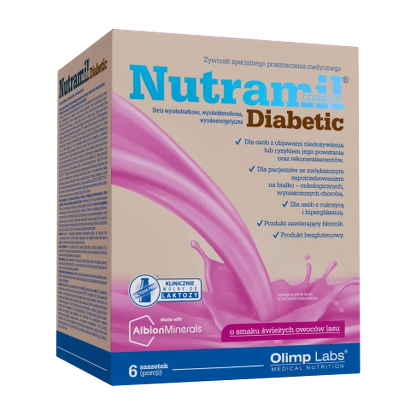 Nutramil Complex Diabetic świeże owoce lasu to środek spożywczy specjalnego przeznaczenia medycznego. Produkt jest przeznaczony dla osób dorosłych z cukrzycą lub insulinoopornością. W składzie znajdują się składniki wspierające zróżnicowaną dietę. Świeże owoce lasu dostarczają naturalnych smaków. Produkt występuje w formie saszetek, co ułatwia jego stosowanie.