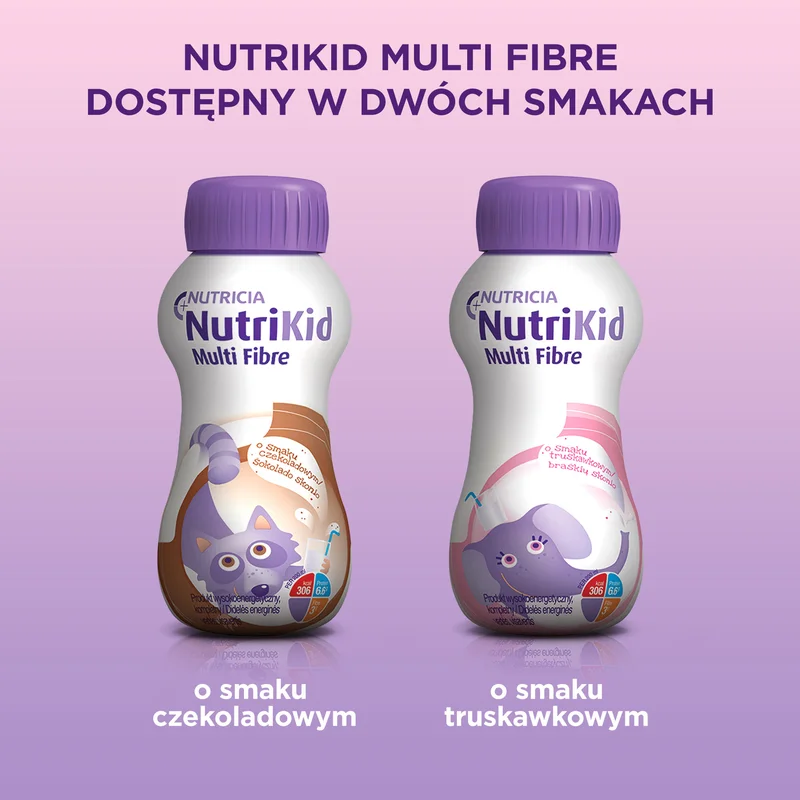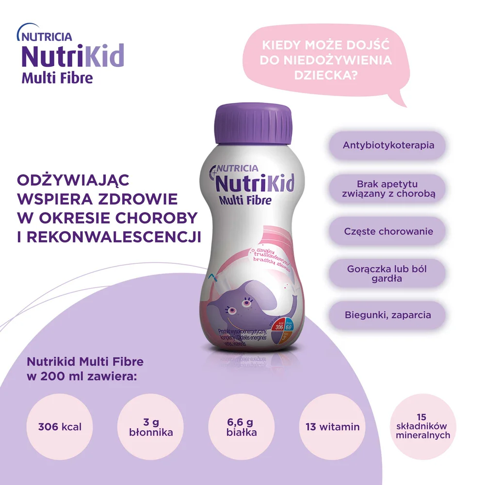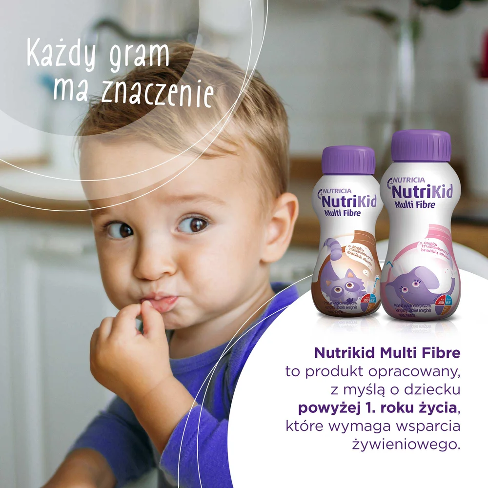 NutriKid Multi Fibre przeznaczony jest dla dzieci powyżej 1. roku życia, które mają problemy ze spożywaniem normalnych posiłków i z dostarczeniem odpowiedniej ilości składników odżywczych i energii z pożywienia, szczególnie w okresie choroby i zaburzeniach wzrastania.Masa netto