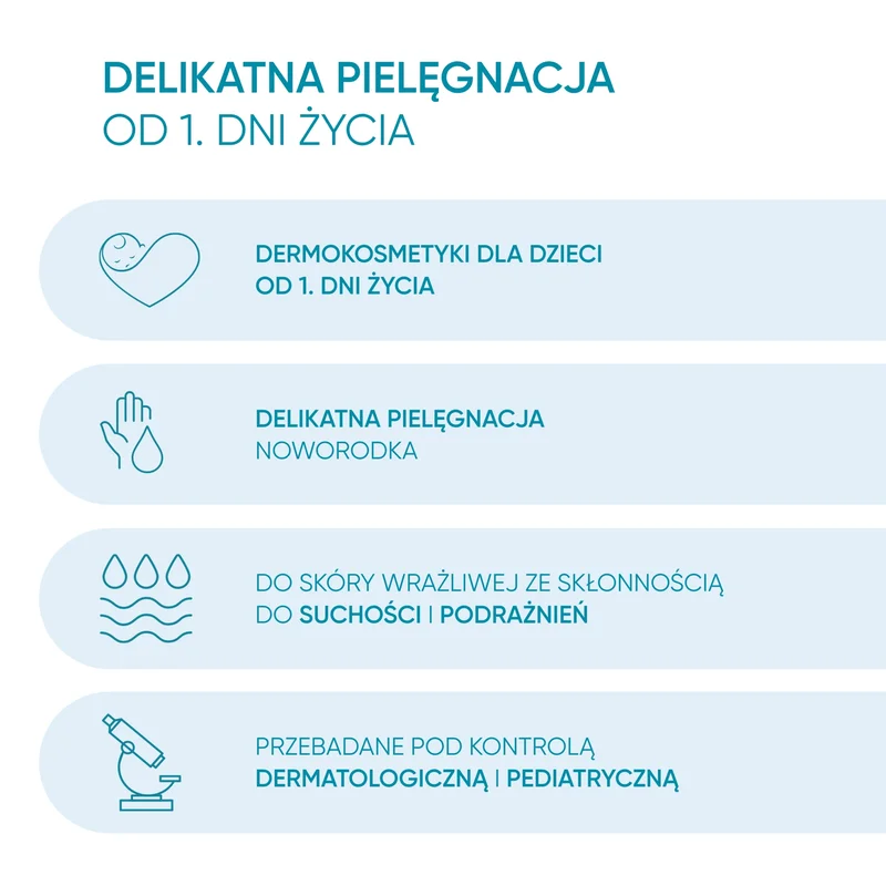 Mycie ciała i włosów: żel nanieść na skórę i włosy, następnie delikatnie spłukać letnią wodą. Kąpiel: niewielką ilość płynu wlać do wody (temp. ok. 36°C) i dokładnie wymieszać. Kąpiel niemowlęcia powinna trwać 5-7 minut.Informacje o bezpieczeństwie