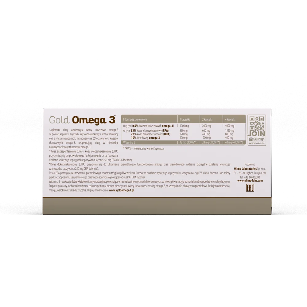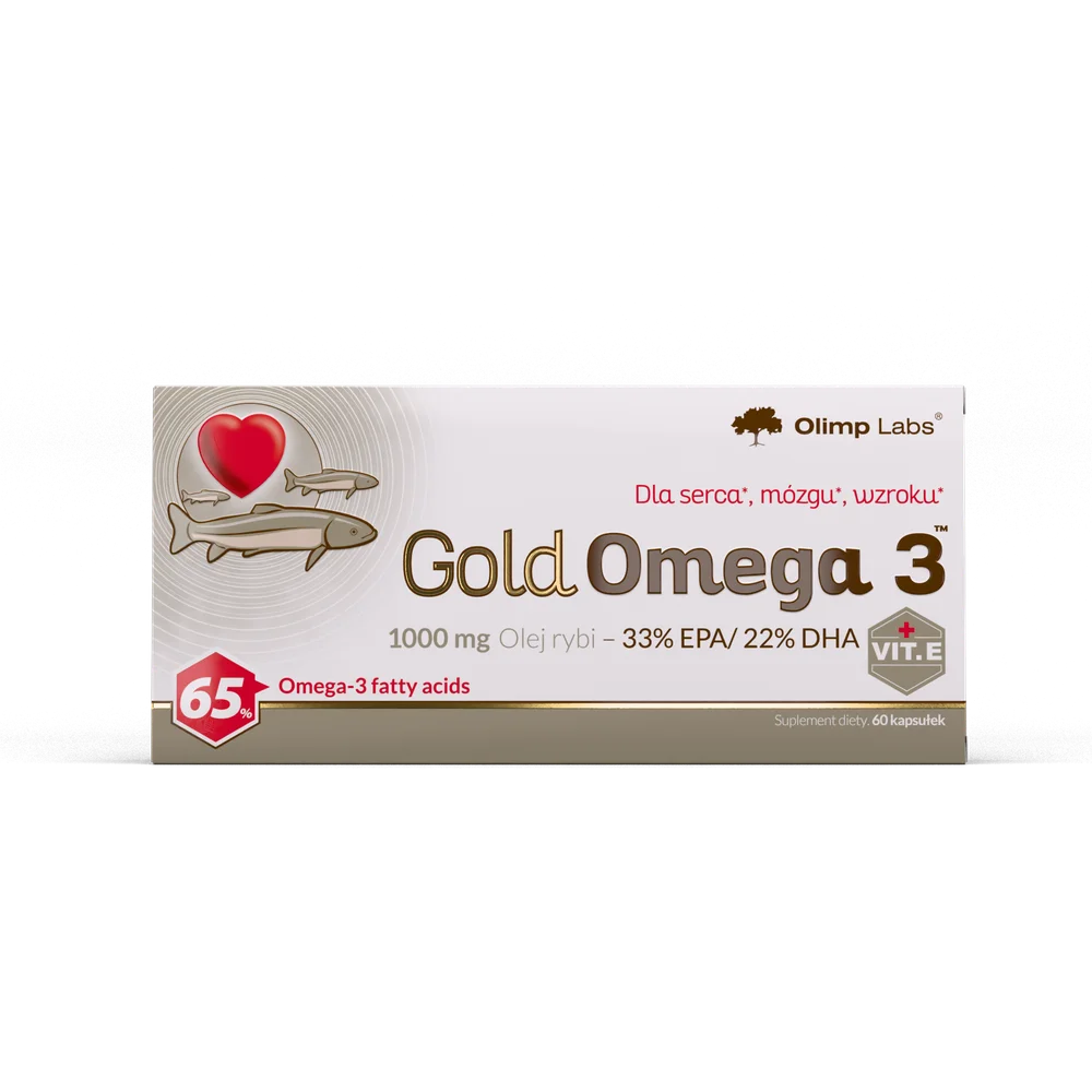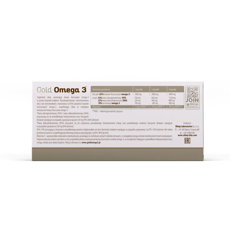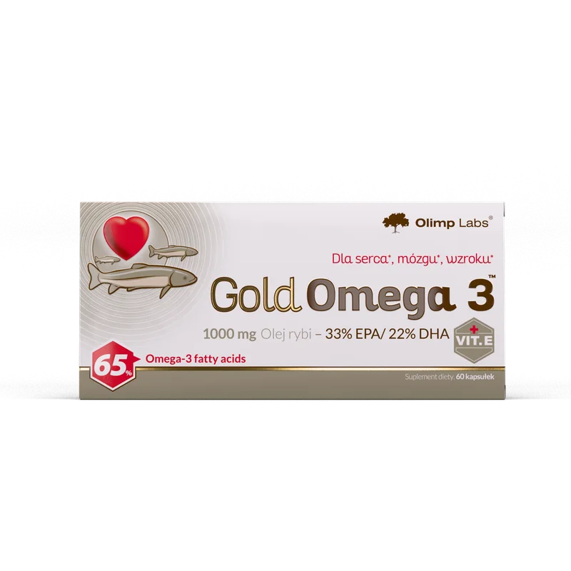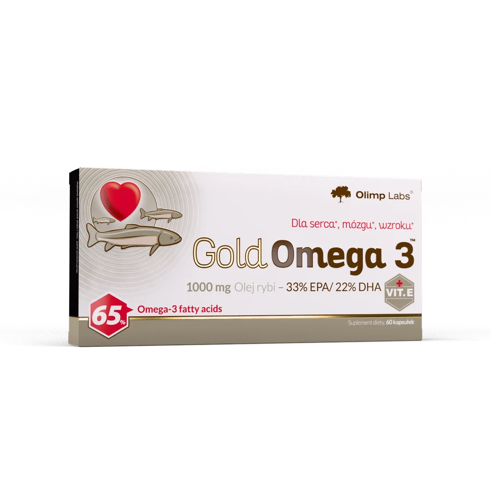 Olimp Gold Omega 3 to suplement diety zawierający koncentrat oleju rybiego. Dostarcza nienasycone kwasy tłuszczowe omega-3, które pomagają uzupełnić codzienną dietę w DHA i EPA. Produkt przeznaczony jest dla dorosłych.
