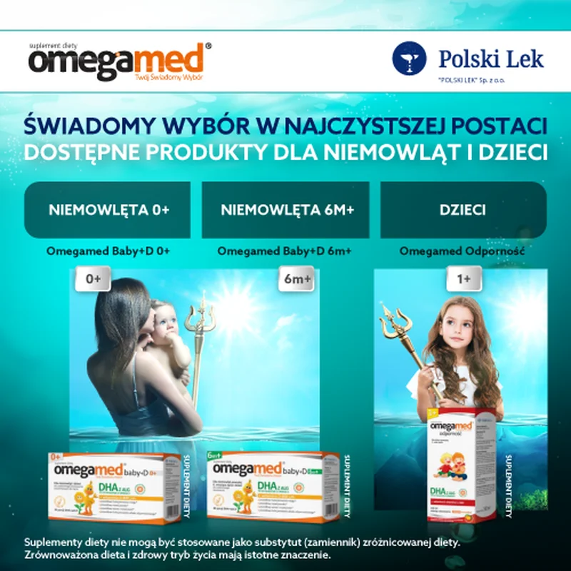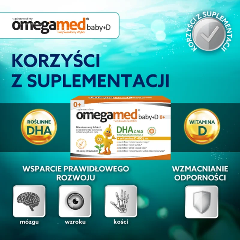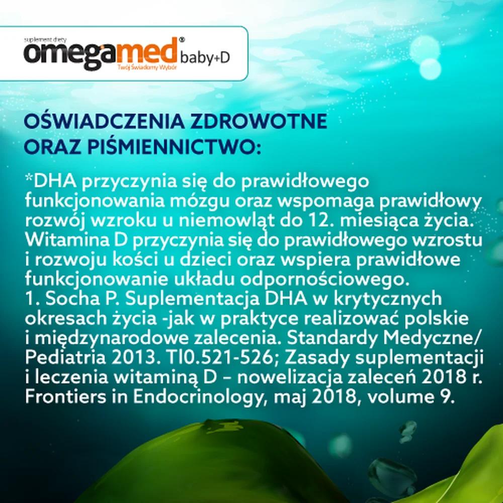 OMEGAMED Baby DHA z alg + Wit D to suplement diety przeznaczony dla niemowląt i dzieci od 0+. Składniki suplementu, takie jak DHA pochodzenia algowego, wspierają rozwój mózgu, a witamina D pomaga w utrzymaniu prawidłowego funkcjonowania układu odpornościowego. Produkt jest zalecany w przypadku potrzeby uzupełnienia diety w te składniki odżywcze.Składniki