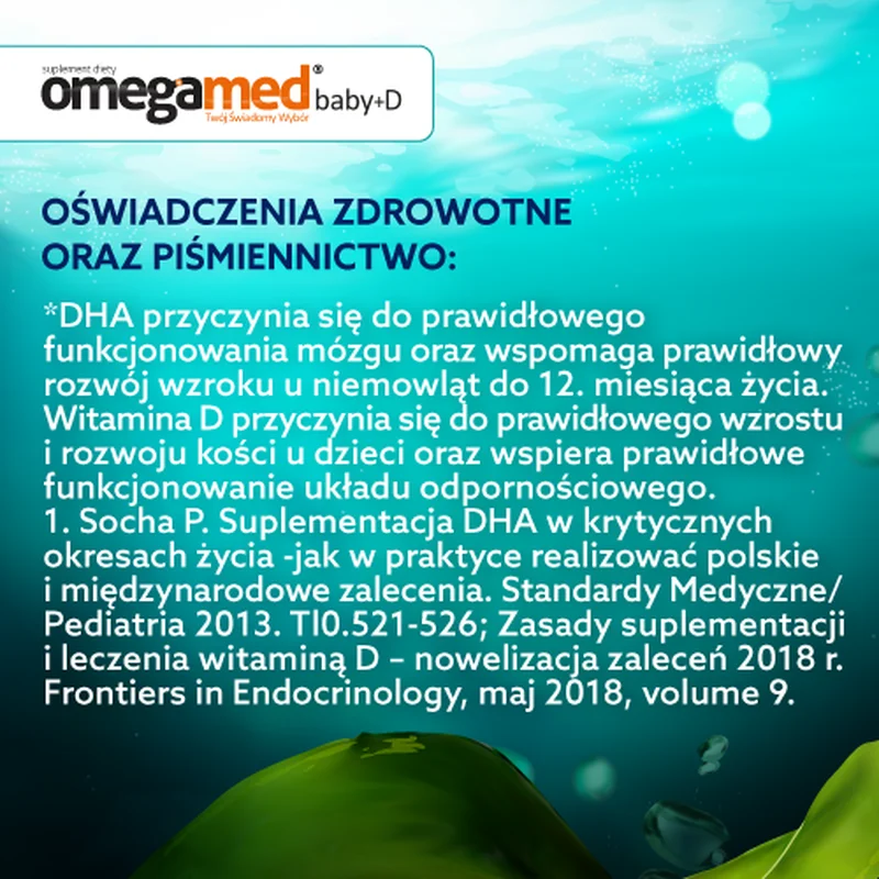 OMEGAMED Baby DHA z alg + Wit D to suplement diety przeznaczony dla niemowląt i dzieci od 0 roku życia. Składniki suplementu, w tym kwasy tłuszczowe DHA pochodzące z alg oraz witamina D, wspierają prawidłowy rozwój układu nerwowego i kostno-mięśniowego. Produkt jest odpowiedni dla dzieci, które potrzebują wsparcia w zakresie tych składników odżywczych.Składniki