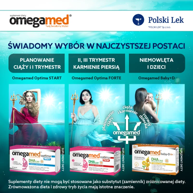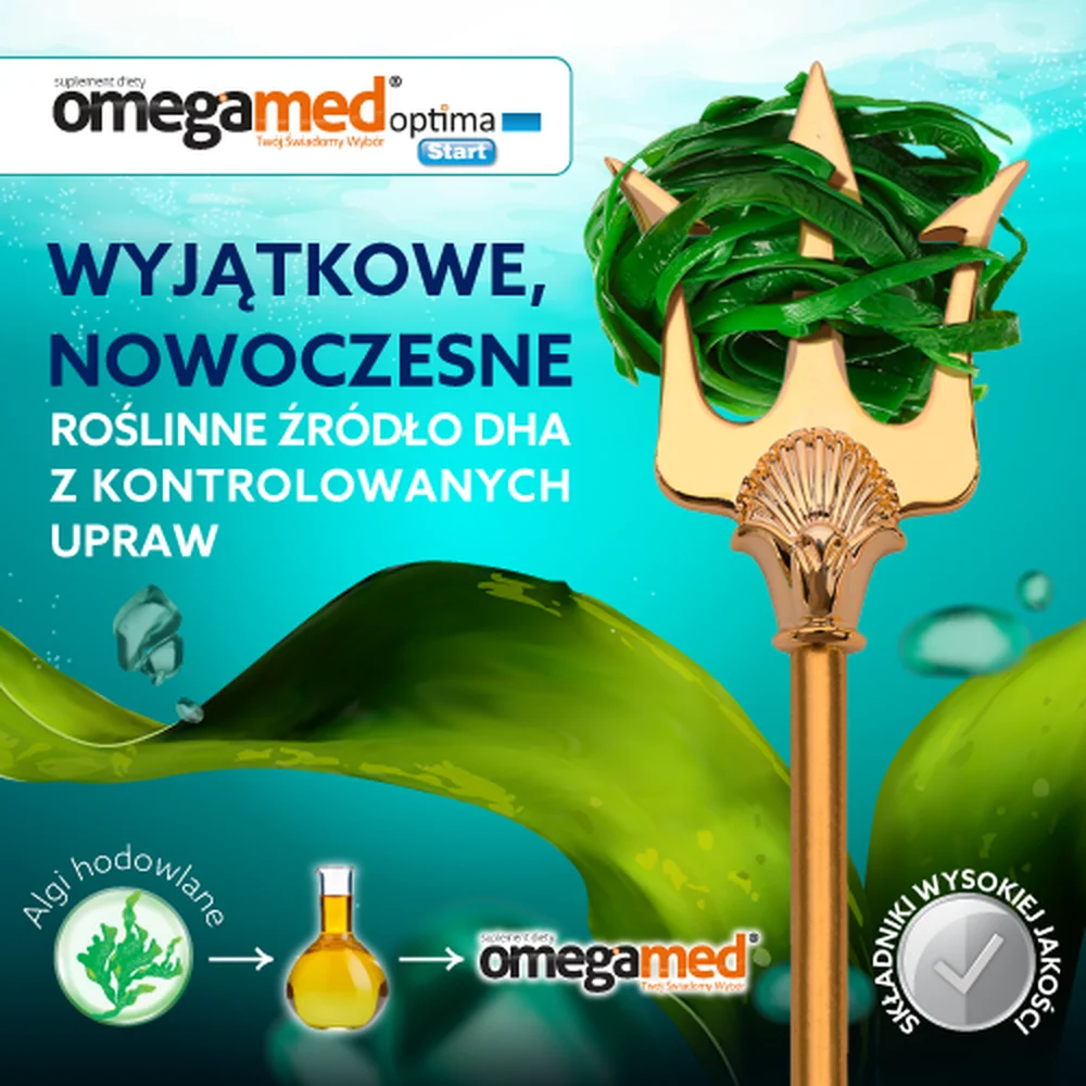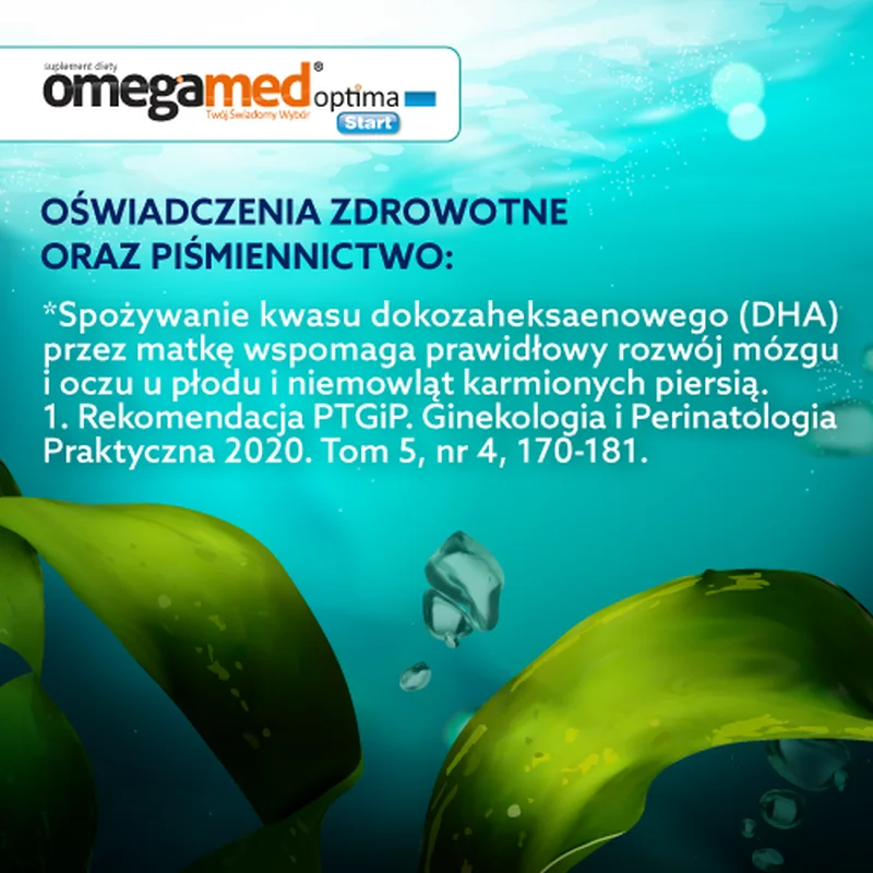 Omegamed® Optima START to preparat opracowany specjalnie dla kobiet planujących ciążę oraz w pierwszych miesiącach ciąży. Optymalny skład, opracowany z udziałem specjalistów, zapewnia codzienną porcję składników ważnych m.in. dla prawidłowego rozwoju mózgu i oczu u płodu i niemowląt karmionych piersią*.
