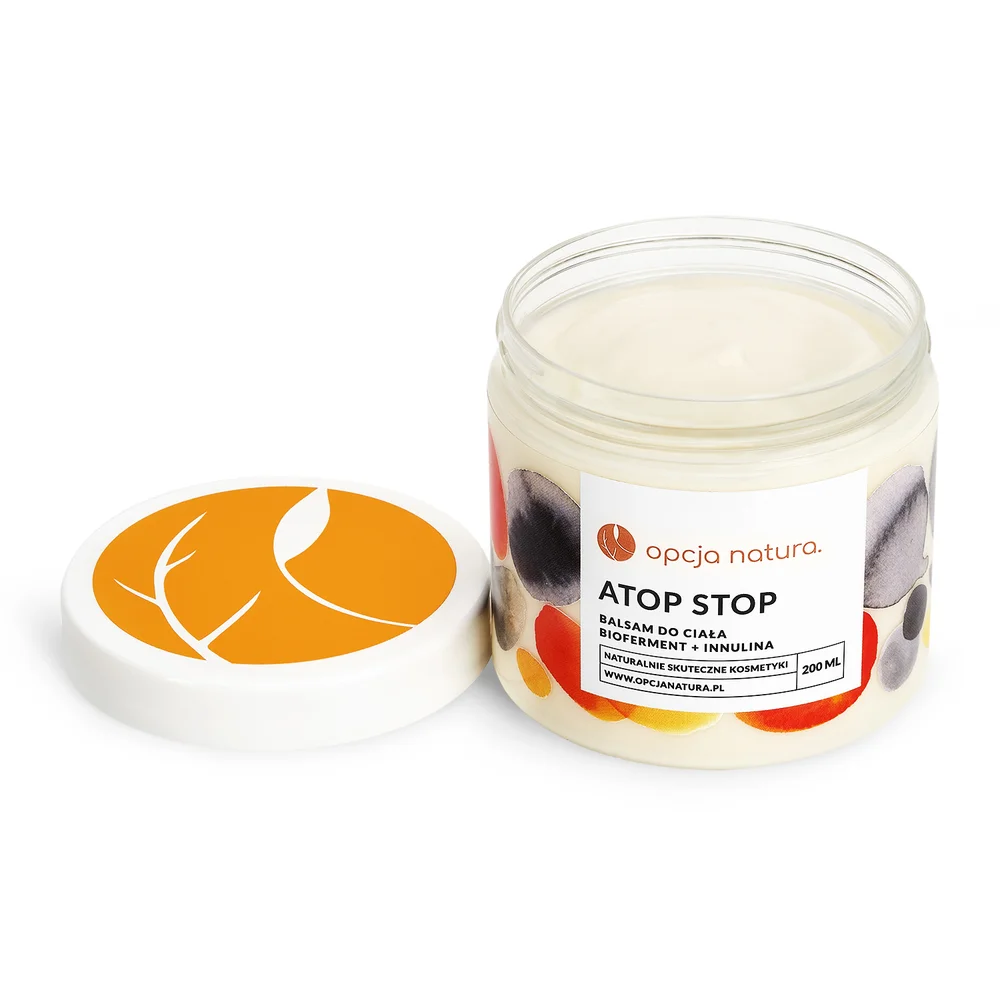 Opcja Natura, atop stop balsam do ciała z biofermentem i innuliną to produkt kosmetyczny. Przeznaczony jest do pielęgnacji skóry wrażliwej i atopowej. Zawiera bioferment oraz innulinę, które wspierają nawilżenie i regenerację. Balsam łagodzi uczucie szorstkości, przynosząc uczucie komfortu. Produkt ma działanie uzupełniające, wspierające naturalną barierę ochronną skóry. Stworzony z myślą o osobach z problemami dermatologicznymi. Nie zawiera parabenów ani sztucznych dodatków.Składniki/Ingredients