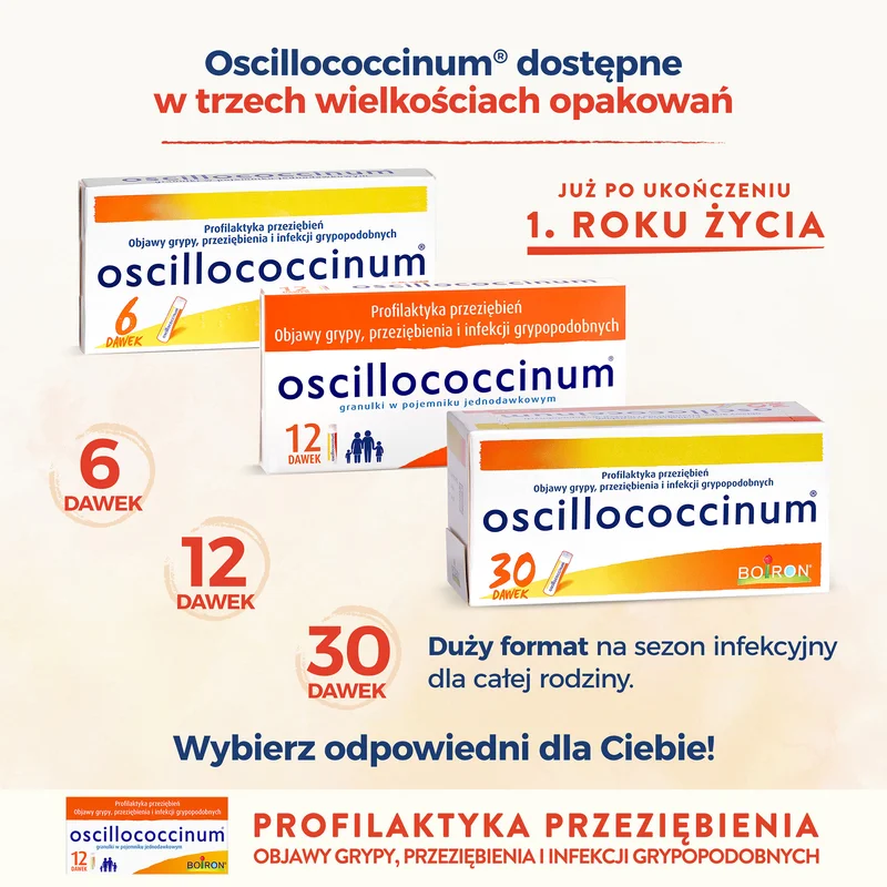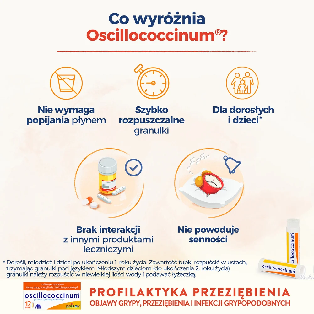 Oscillococcinum® to homeopatyczny produkt leczniczy dostępny w postaci granulek, odpowiedni dla dorosłych, młodzieży oraz dzieci od 1. roku życia. Stosuje się go w celu złagodzenia objawów towarzyszących grypie, przeziębieniu oraz innym infekcjom o zbliżonym charakterze. Produkt może być również wykorzystywany profilaktycznie jako element wsparcia organizmu w okresach zwiększonego ryzyka zachorowań.