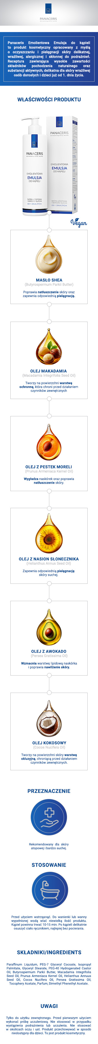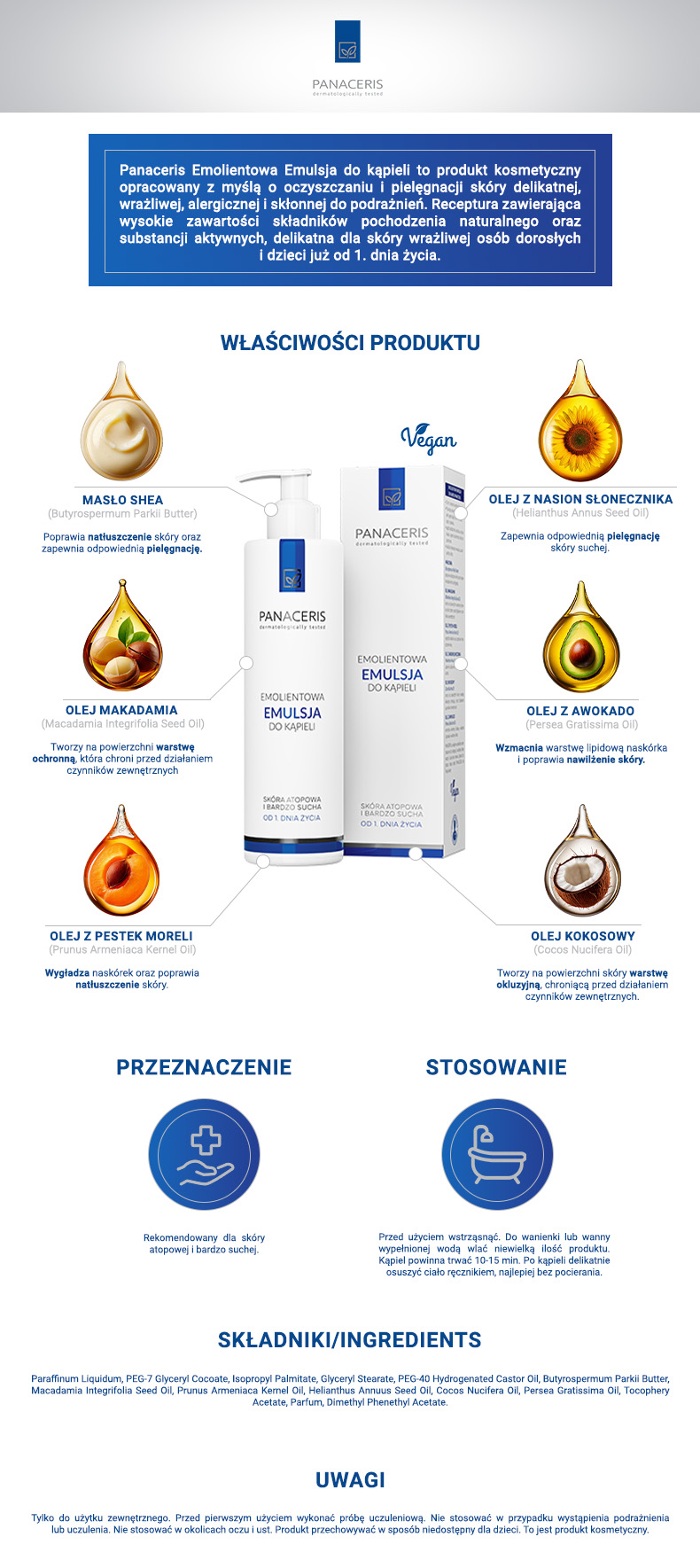 Panaceris emolientowa emulsja do kąpieli nawilża, wygładza i wspiera naturalne procesy regeneracyjne skóry atopowej i suchej. Zawiera wysoką zawartość składników pochodzenia naturalnego oraz substancji aktywnych, delikatnych dla wrażliwej skóry dorosłych i dzieci od 1. dnia życia. Masło Shea odbudowuje barierę lipidową naskórka, głęboko natłuszcza, nawilża, przywraca skórze gładkość i elastyczność. Olej z nasion słonecznika zapobiega odparowywaniu wody, regeneruje i zmiękcza naskórek. Olej z pestek moreli wygładza skórę i poprawia jej natłuszczenie, a olej z awokado wzmacnia warstwę lipidową naskórka i poprawia nawilżenie. Produkt jest przebadany dermatologicznie i rekomendowany od 1. dnia życia, produkt posiada bardzo bogatą recepturę i jest odpowiedni dla wegan.