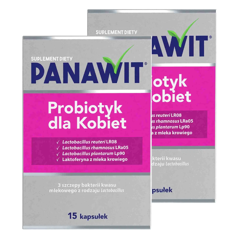 - Panawit Probiotyk dla Kobiet zawiera trzy szczepy bakterii Lactobacillus reuteri, Lactobacillus rhamnosus oraz Lactobacillus plantarum wspierające prawidłową równowagę mikroflory jelitowej.