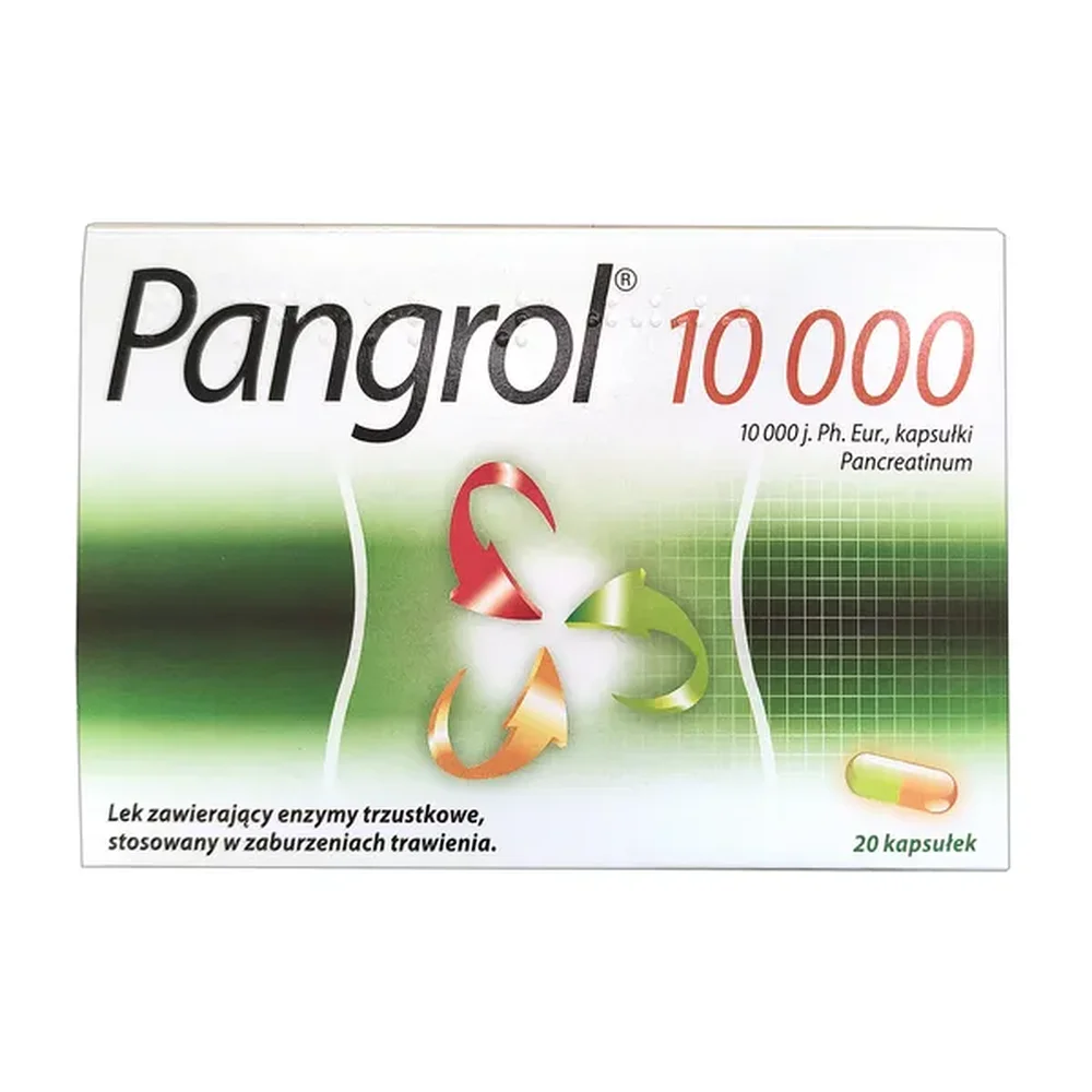 Pangrol 10 000 to lek w postaci kapsułek zawierający substancje wspomagające trawienie (enzymy) pochodzenia wieprzowego (sproszkowana trzustka zwana też pankreatyną).