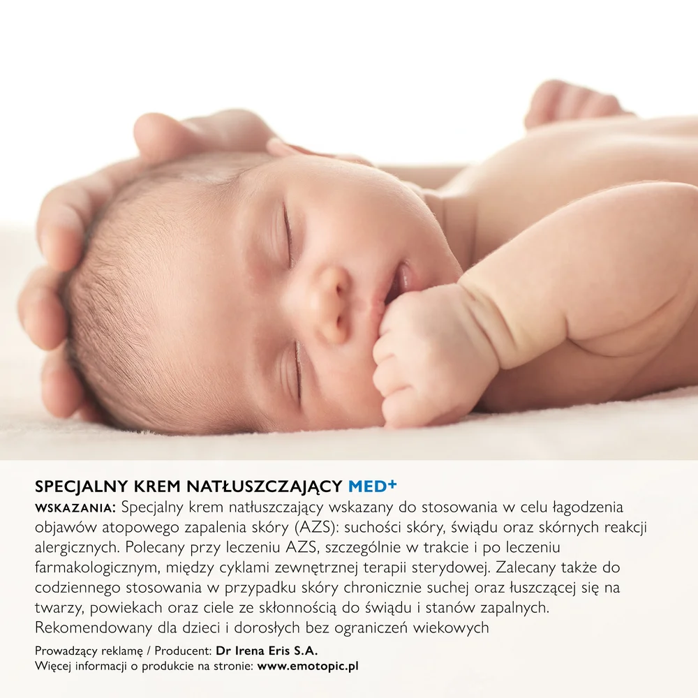 Emotopic specjalny krem natłuszczający MED+ na twarz, powieki i ciało do codziennego stosowania - wyrób medyczny zawierający składniki, które łagodzą objawy i wspomagają leczenie w przebiegu atopowego zapalenia skóry.