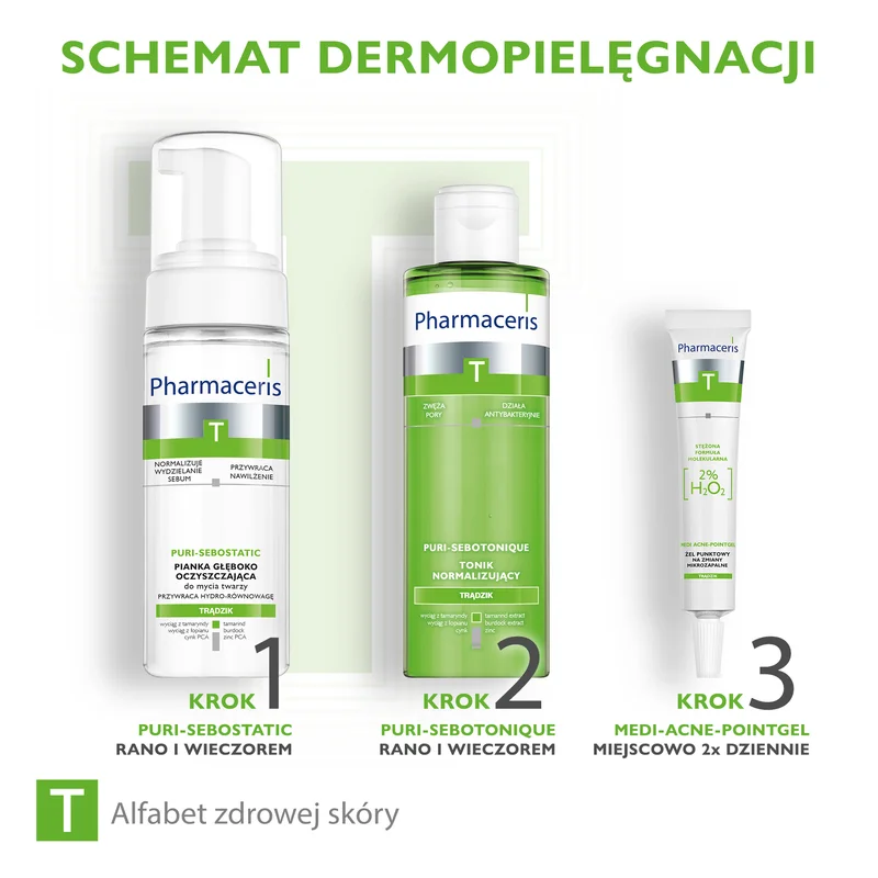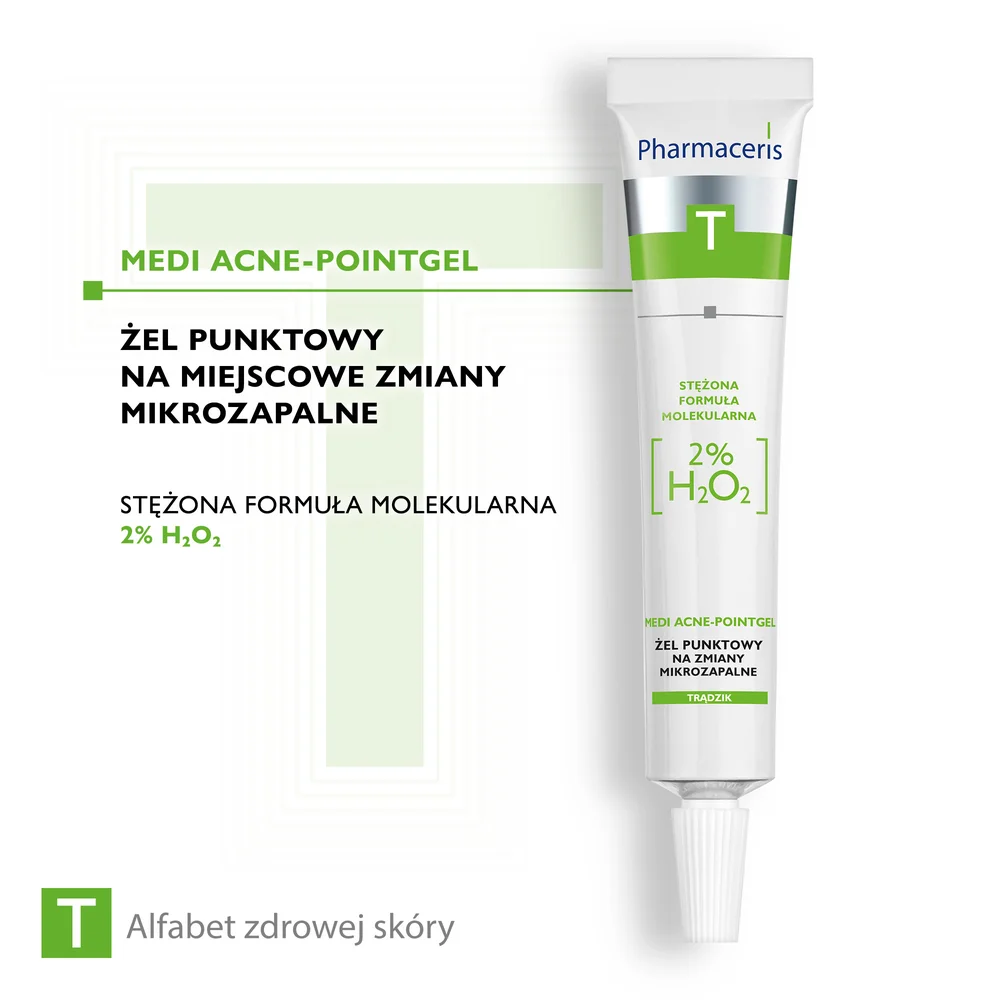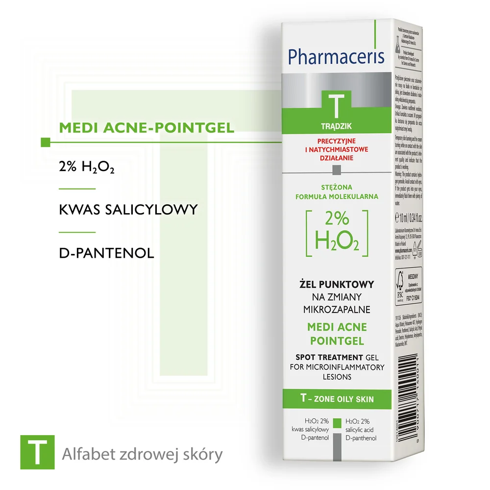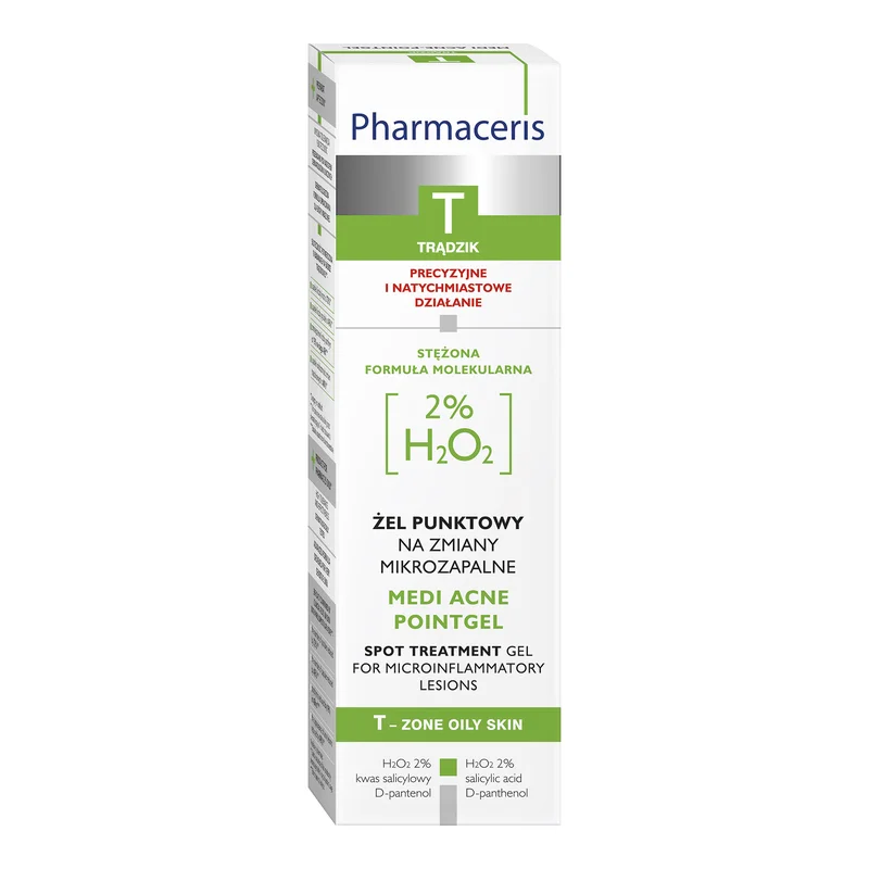 H2O2 2% - wykazuje celowane działanie molekularne na zmiany trądzikowe, efektywnie zmniejszając nasilenie istniejących zmian i zapobiegając powstawaniu nowych niedoskonałości. Kw. Salicylowy - delikatnie złuszcza zrogowaciały naskórek, regulując odnowę komórkową skóry. Przywraca równomierną strukturę skóry oraz zmniejsza tendencję do tworzenia się zaskórników. D-pantenol - o właściwościach kojących i łagodzących, zmniejsza tendencję do nadwrażliwości skóry. Łagodzi podrażnienia i zaczerwienienia.Przeznaczenie produktu