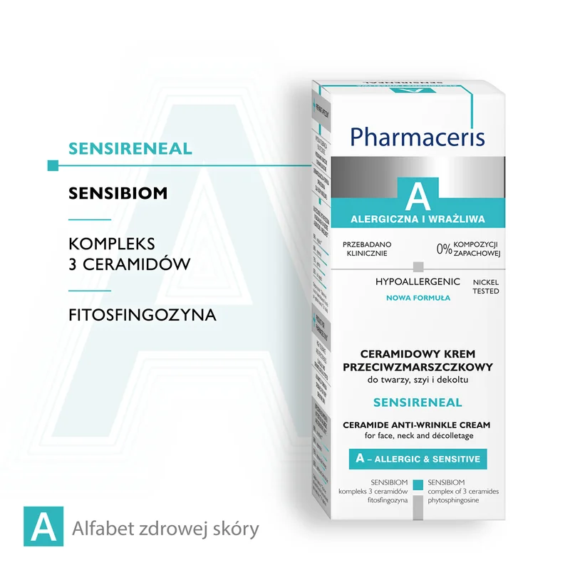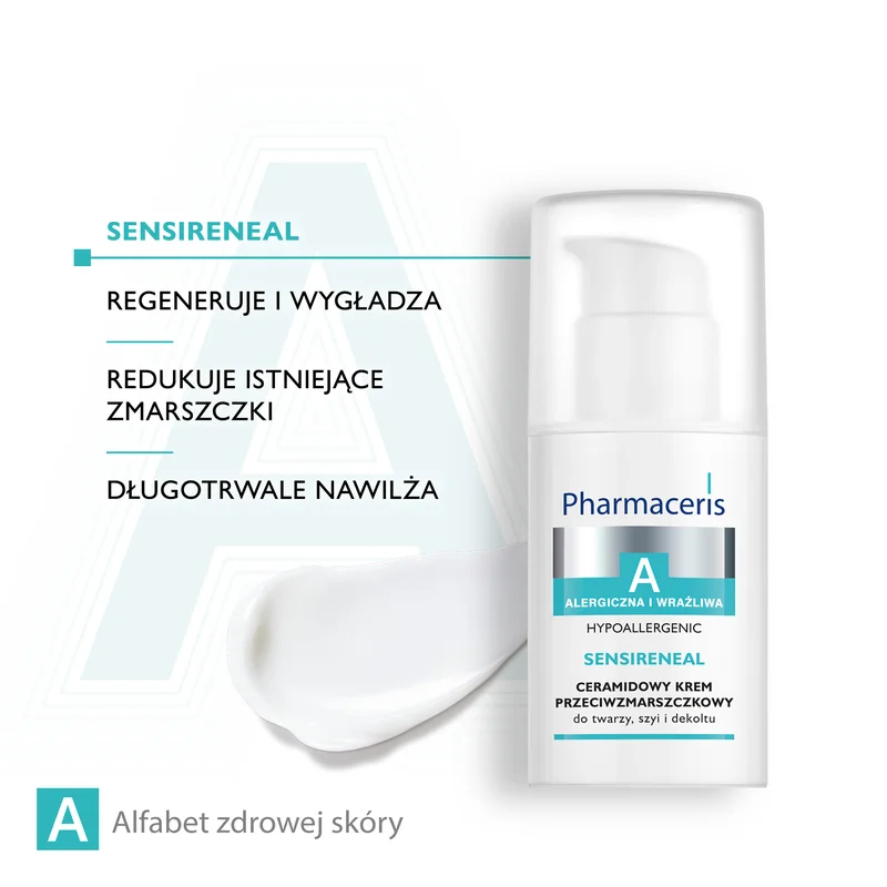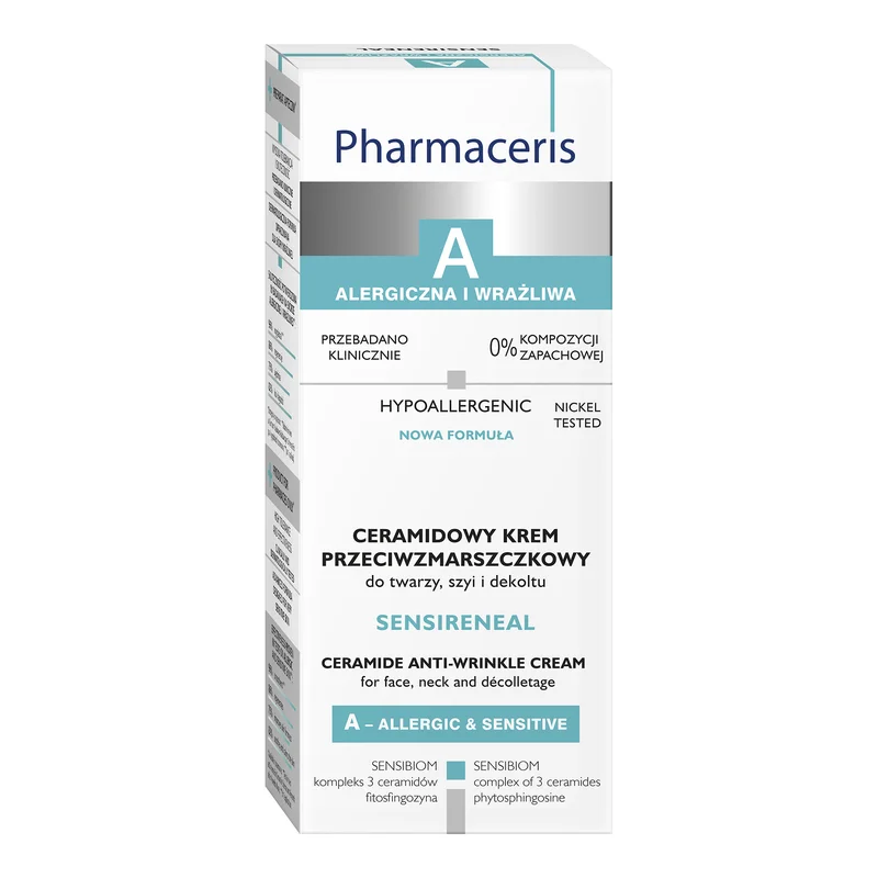 Pharmaceris A, Sensireneal, ceramidowy krem przeciwzmarszczkowy to produkt kosmetyczny stworzony z myślą o codziennej pielęgnacji skóry twarzy, szyi i dekoltu. Doskonale sprawdza się w pielęgnacji skóry dojrzałej, wrażliwej oraz skłonnej do alergii.