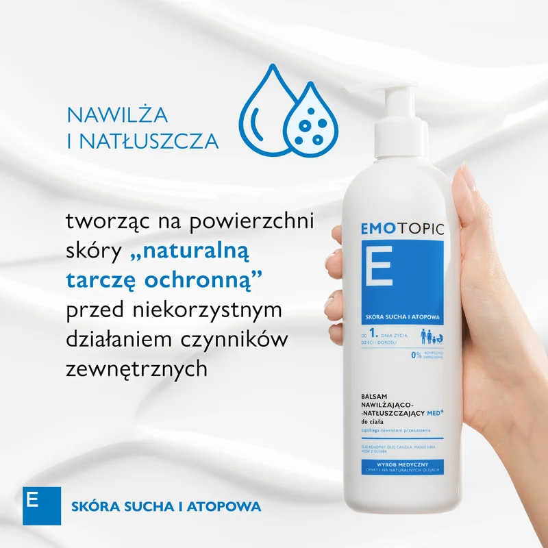 Emotopic Med+, balsam nawilżająco-natłuszczający, to wyrób medyczny przeznaczony do codziennej pielęgnacji skóry przesuszonej i atopowej. Produkt może być stosowany u całej rodziny, w tym u dzieci już od 1. dnia życia, wspierając nawilżenie i odbudowę bariery ochronnej skóry.
