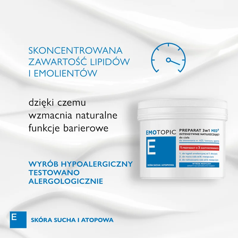 Emotopic preparat 3w1 MED+ intensywnie natłuszczający do ciała - wyrób medyczny rekomendowany przy dolegliwościach skóry suchej i różnych postaciach egzemy.