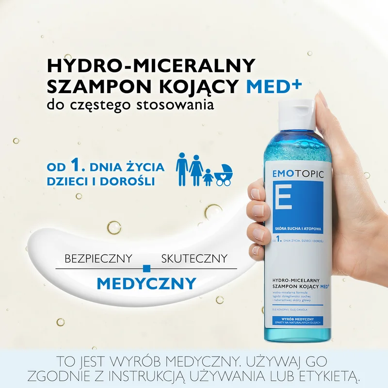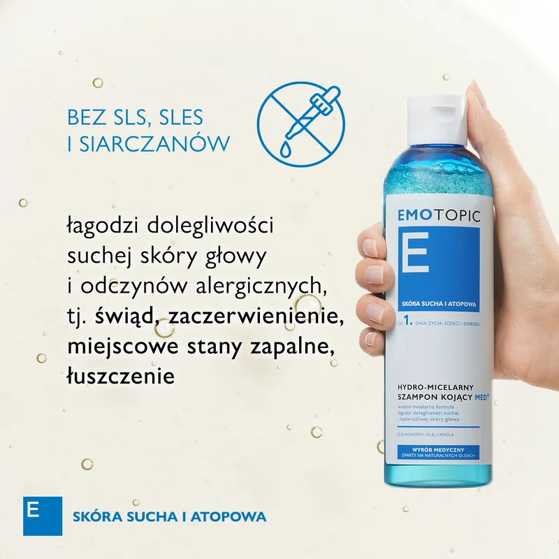 Emotopic, hydro-micelarny szampon kojący to wyrób medyczny opracowany do delikatnego oczyszczania skóry głowy wrażliwej, suchej i podatnej na podrażnienia, szczególnie w przypadku atopowego zapalenia skóry (AZS). Może być stosowany wspomagająco w pielęgnacji skóry głowy u osób z łuszczycą lub egzemą. Sprawdza się również u osób ze skłonnością do alergii, świądu i łupieżu.
