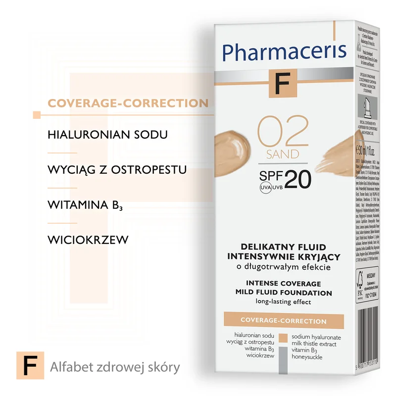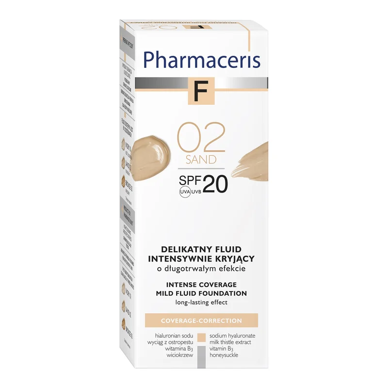 Pharmaceris F delikatny fluid intensywnie kryjący SPF 20, 02 Sand to produkt kosmetyczny, który maskuje niedoskonałości i pielęgnuje skórę. Produkt odpowiedni dla osób dorosłych.