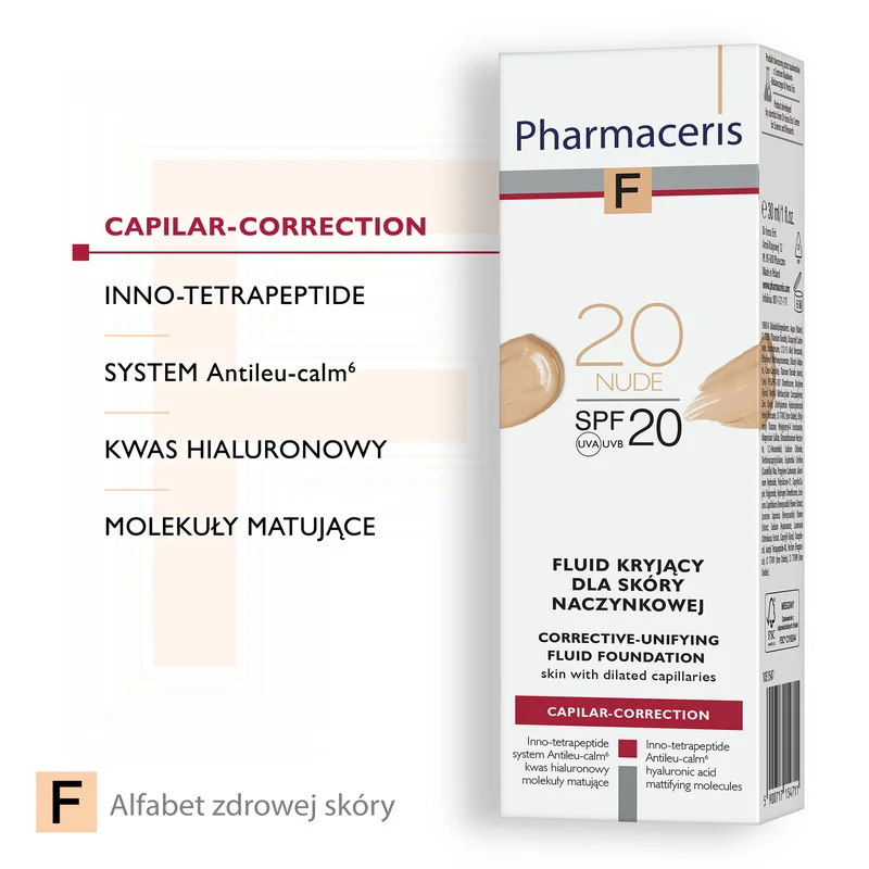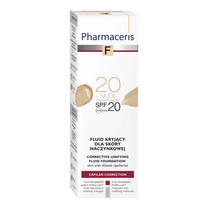 Pharmaceris F Fluid kryjący dla skóry naczynkowej SPF20, 20 Nude jest kosmetykiem stworzonym specjalnie z myślą o skórze naczynkowej i nadreaktywnej, która wymaga wyrównania kolorytu i ukrycia niedoskonałości. Jego stosowanie rekomendowane jest również w celu wzmocnienia naczyń krwionośnych i redukcji tendencji do nasilania się zmian rumieniowych i podrażnień.Stosowanie produktu