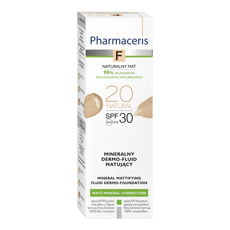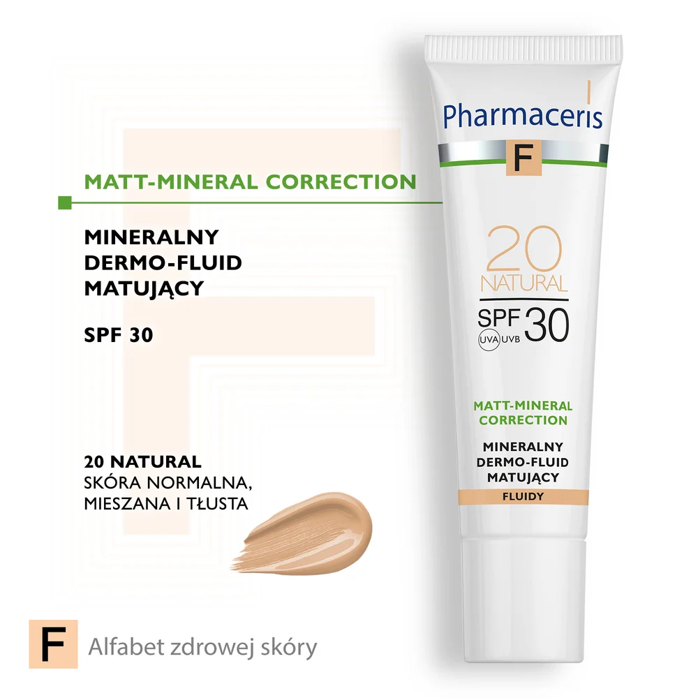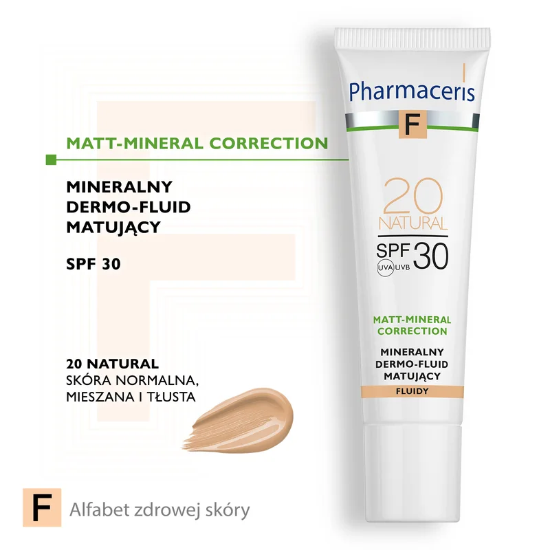 Pharmaceris F Mineralny dermo-fluid matujący Natural 20 to kosmetyk do codziennego makijażu, wskazany dla cery normalnej, mieszanej i tłustej, skłonnej do nadmiernego błyszczenia. Rekomendowany dla osób poszukujących receptury o naturalnym składzie, zmagających się z problemem trądziku, w celu ukrycia i niwelowania niedoskonałości (krosty, zaskórniki, rozszerzone pory, zaczerwienienia, nierówności struktury skóry, płytkie blizny), także dla osób w trakcie farmakoterapii (miejscowa i ogólnoustrojowa).Stosowanie produktu