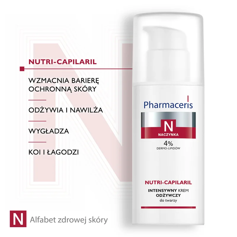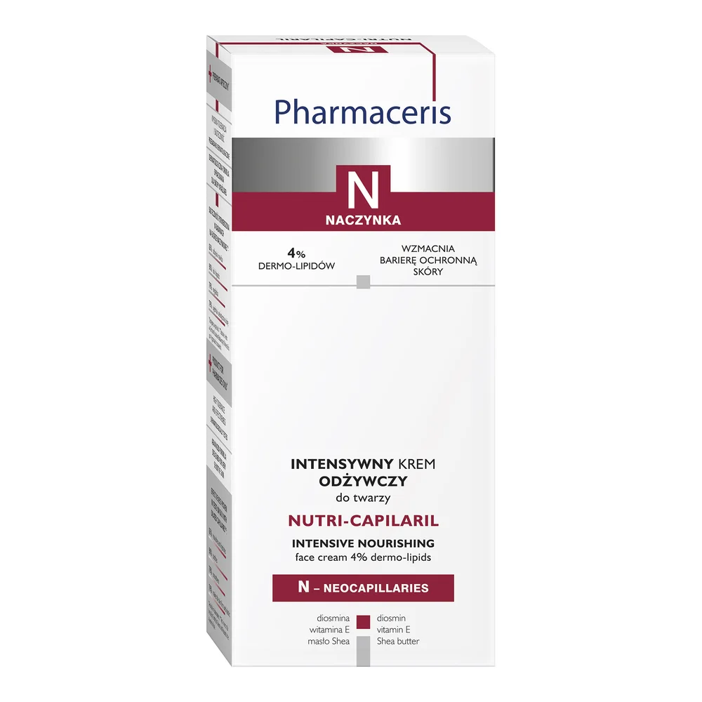 Pharmaceris N Nutri-Capilaril intensywny krem odżywczy do twarzy to produkt kosmetyczny przeznaczony do codziennej pielęgnacji skóry normalnej, przesuszonej, łuszczącej się, szorstkiej, zaczerwienionej oraz naczynkowej.