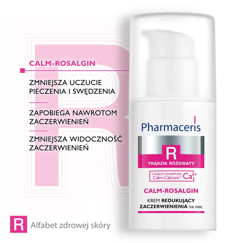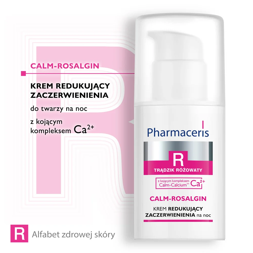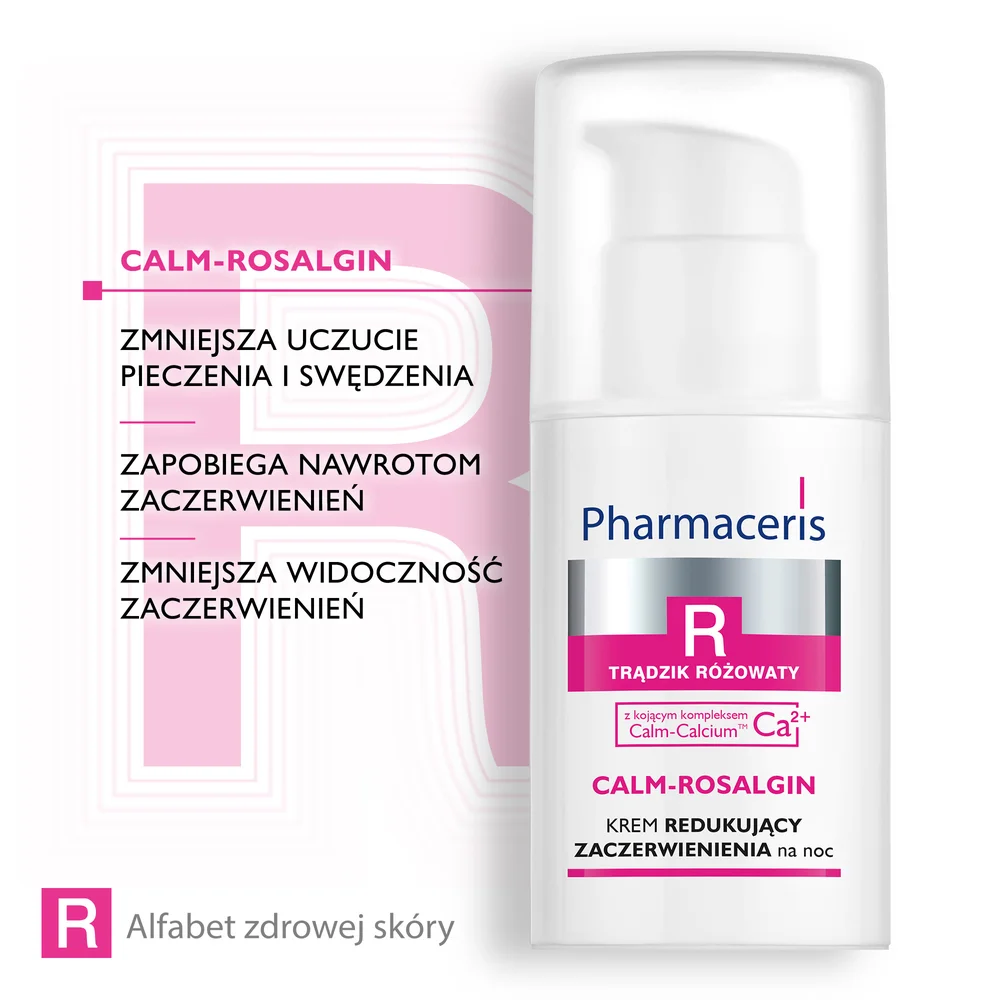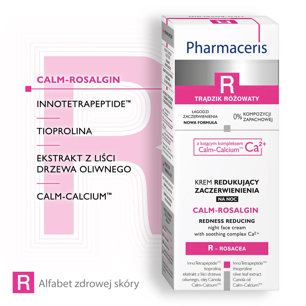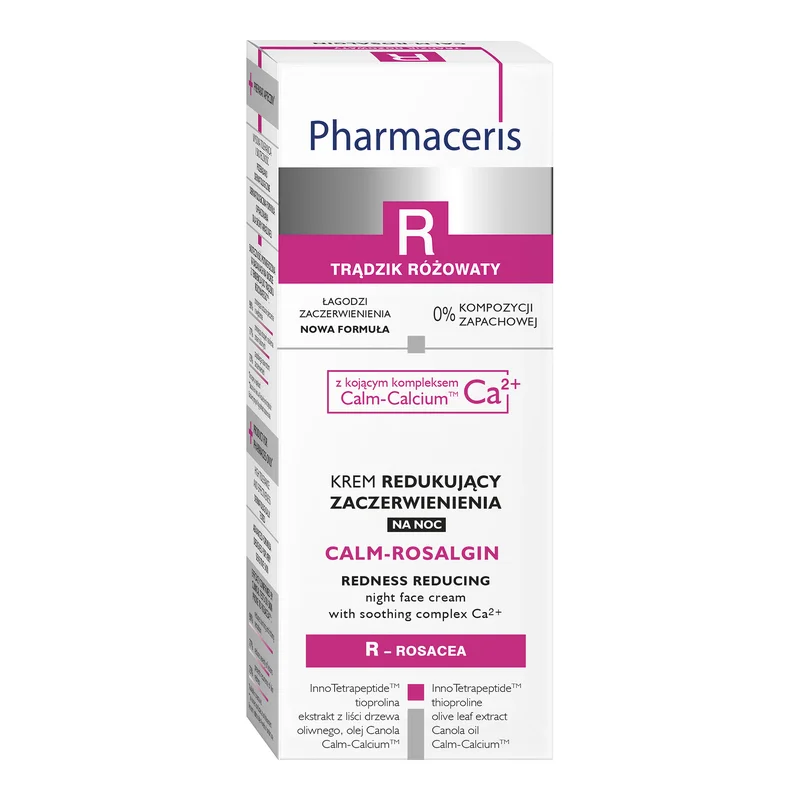 Pharmaceris R Calm-Rosalgin, krem redukujący zaczerwienienia na noc, 30 ml to kosmetyk, którego komplementarne działanie trzech składników aktywnych – InnoTetrapeptide, ekstraktu z liści drzewa oliwnego oraz tioproliny – koncentruje się na łagodzeniu zaburzeń skórnych związanych z trądzikiem różowatym. Krem wspiera detoksykację komórek skóry, intensywną regenerację i odżywienie, zmniejszając widoczność grudek, krostek i naczynek. Jony wapnia Calm-Calcium Ca²⁺ łagodzą podrażnienia, a D-pantenol, olej Canola i alantoina zmniejszają nadreaktywność skóry. Olej z czarnych porzeczek przywraca równowagę skóry oraz wspiera jej jędrność i elastyczność. Preparat działa antybakteryjnie, łagodzi uczucie pieczenia i swędzenia oraz zapobiega nawrotom zmian, zapewniając odpowiednie nawilżenie i komfort skóry.