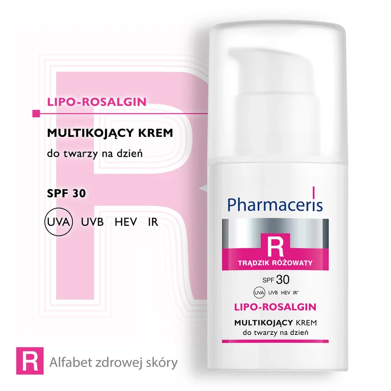 Pharmaceris R LIPO-ROSALGIN, multikojący krem do twarzy na dzień SPF 30, to produkt kosmetyczny przeznaczony do pielęgnacji skóry z objawami trądziku różowatego.