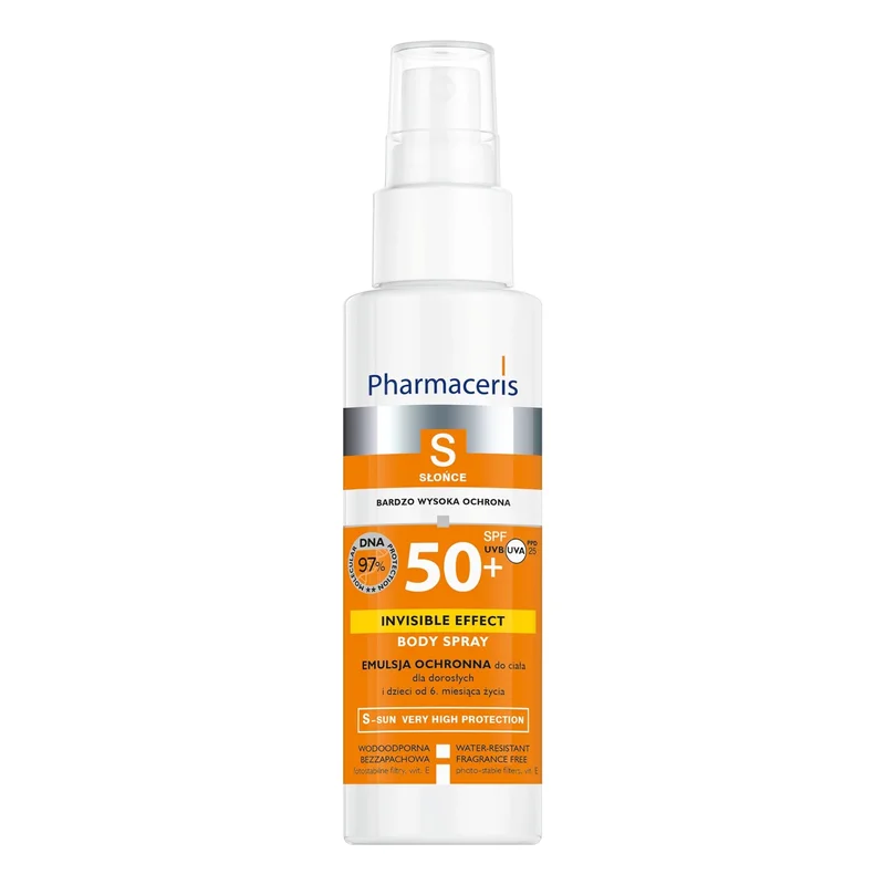 Pharmaceris S Invisible Efect Body to produkt kosmetyczny w formie sprayu emulsji ochronnej do ciała z filtrem SPF 50+. Chroni skórę przed szkodliwym działaniem promieniowania UVB i UVA. Dzięki lekkiej formule, emulsja jest łatwa do nałożenia i dobrze się wchłania, pozostawiając niewidoczny film na skórze. Produkt jest wodoodporny, co zapewnia długotrwałą ochronę. Przeznaczony jest do skóry wrażliwej i skłonnej do alergii.Składniki/Ingredients