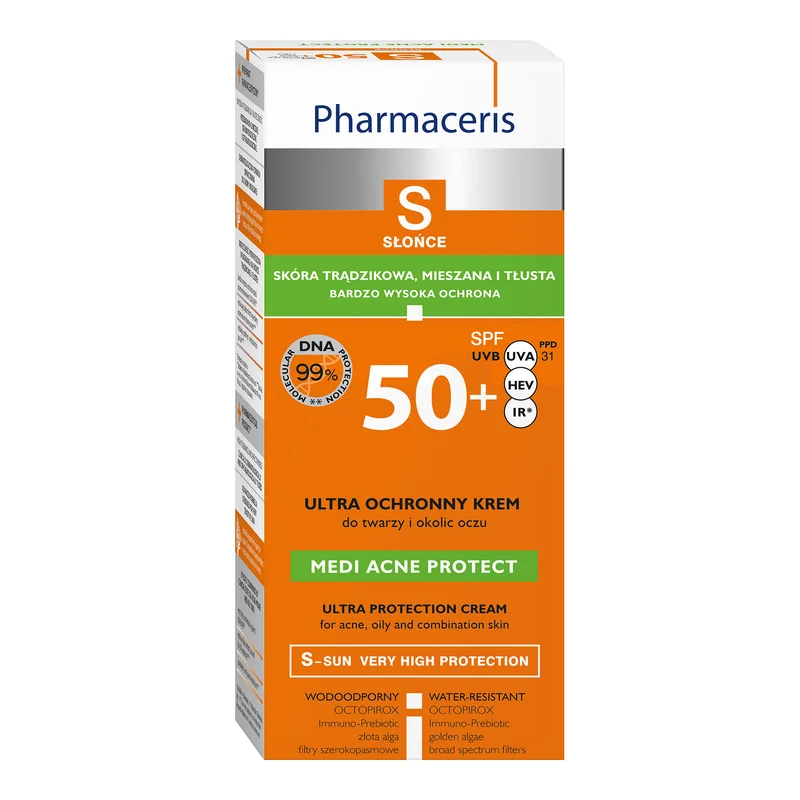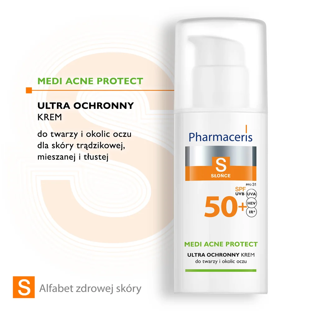Pharmaceris S Medi Acne Protect ultra ochronny krem do twarzy i okolic oczu SPF 50+ to produkt kosmetyczny, który zabezpiecza skórę przed promieniowaniem UVA i UVB. Produkt odpowiedni jest do cery trądzikowej, przetłuszczającej się, mieszanej i skłonnej do powstawania niedoskonałości.