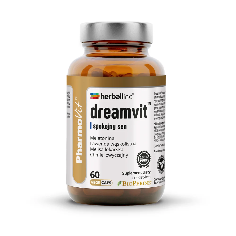PharmoVit Dreamvit Spokojny sen to suplement diety, którego składniki wspierają prawidłowy przebieg snu oraz pomagają w relaksacji. Formuła zawiera naturalne ekstrakty i składniki, takie jak melisa, kozłek i magnez, które mogą wpływać na komfort zasypiania. Suplement jest polecany dla osób poszukujących wsparcia w utrzymaniu równowagi w codziennym życiu.Składniki
