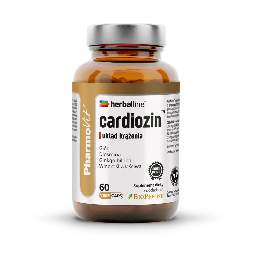 PharmoVit Herballine Cardiozin to suplement diety, którego składniki wspierają odpowiednią funkcję układu sercowo-naczyniowego, a także przyczyniają się do utrzymania prawidłowego poziomu cholesterolu oraz ciśnienia krwi. Formuła opiera się na naturalnych ekstraktach roślinnych, które mają na celu wspomaganie organizmu w zachowaniu równowagi i dobrego samopoczucia. Produkt jest dostępny w formie kapsułek, co ułatwia jego stosowanie.Składniki