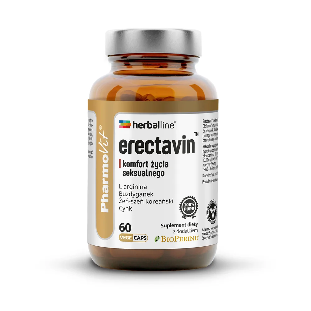 PharmoVit Herballine Erectavin to suplement diety, którego składniki wspierają naturalne procesy organizmu. Zawiera roślinne ekstrakty, które mogą przyczyniać się do poprawy funkcji seksualnych. Formuła wzbogacona jest o substancje, które wspomagają wydolność oraz zwiększają energię, co może być istotne w kontekście aktywności fizycznej. Produkt jest polecany dla osób poszukujących rozwiązań opartych na składnikach roślinnych w codziennej suplementacji.Składniki